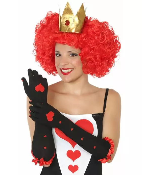 Queen of Hearts to the fingertips These Queen of Hearts gloves are for women (wig, crown, top not included). These black fabric gloves are long and have red heart prints only on the front. At the elbow, a small red lace bow is present on each glove. This accessory will be ideal to complete a Queen of Hearts costume at fancy dress parties or for Carnival. Accessories included: Pair of gloves Material: 100% Polyester Care: Hand wash