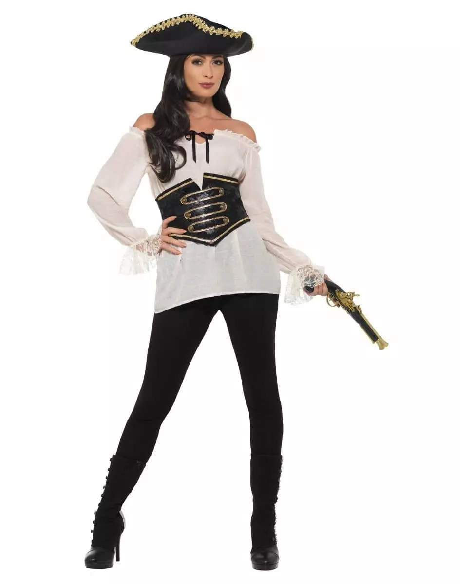 An elegant and sexy pirate! This women's costume consists of a shirt (hat, weapon and pants not included). This long-sleeved shirt has bare shoulders. A black lace is present at the collar and a black belt with laces will mark your waist. The luxury pirate shirt will be perfect to complete your pirate costume for a themed party or during Carnival!. Accessories included: Shirt with belt Material: 100% polyester Care: Hand wash