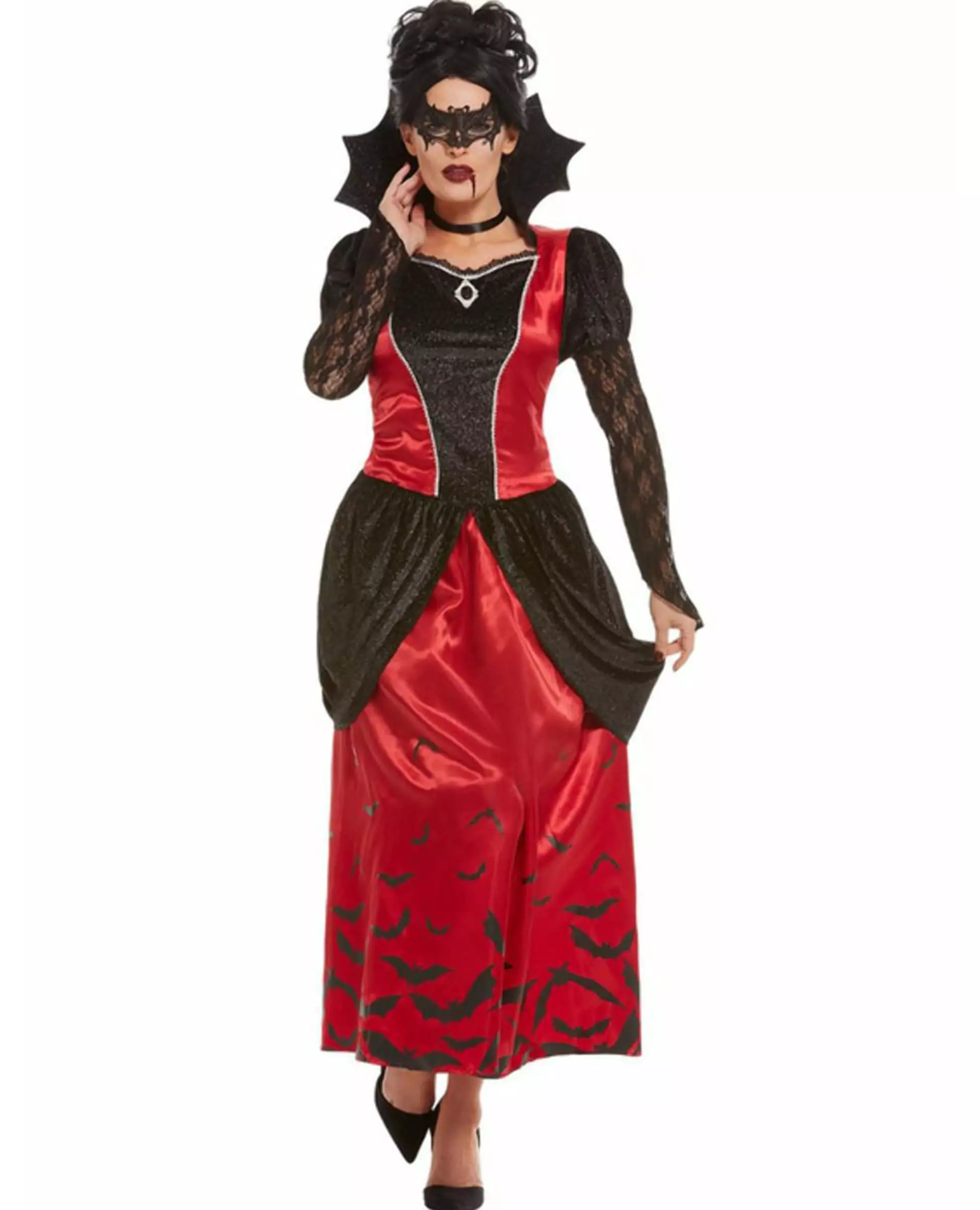 You will be the most chic vampire for Halloween This vampire countess costume for women consists of a dress and a mask (makeup and shoes not included). The long dress is satin red, with black sleeves. Black bats are printed at the bottom of the dress. It has a high spiked collar. The lace-effect mask is black and represents a bat. This costume will be perfect for showing off your charms on Halloween night. Accessories included: Dress Mask Material: 100% Polyester Care: Hand wash