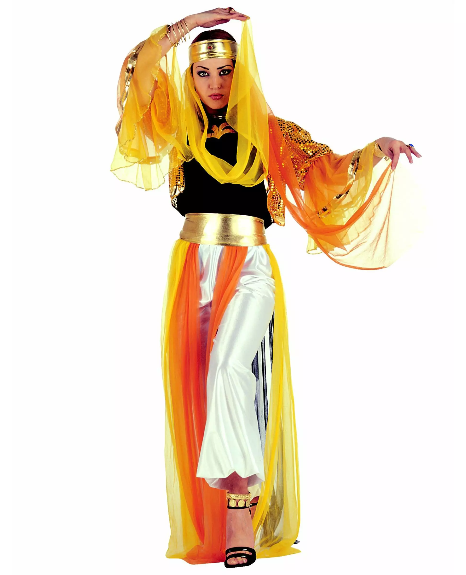 Magnificent veils! This oriental dancer costume for women consists of a top with jacket, pants with veils, a belt and a headdress with veils (shoes not included) The pants are white with yellow veils, the belt is gold and the top is black with a gold sequined jacket. The headdress is a gold headband with yellow veils. This costume is perfect for embodying a real oriental dancer for Carnival or during your costume parties. Copyright Widmann SRL ».. Accessories included: Top Pants Jacket Belt Headdress Material: 100% Polyester Care: Hand wash Measurement information: For size M, top length is approximately 56 cm, pants length is approximately 108 cm. For size S, top length is approximately 54 cm, pants length is approximately 107 cm.