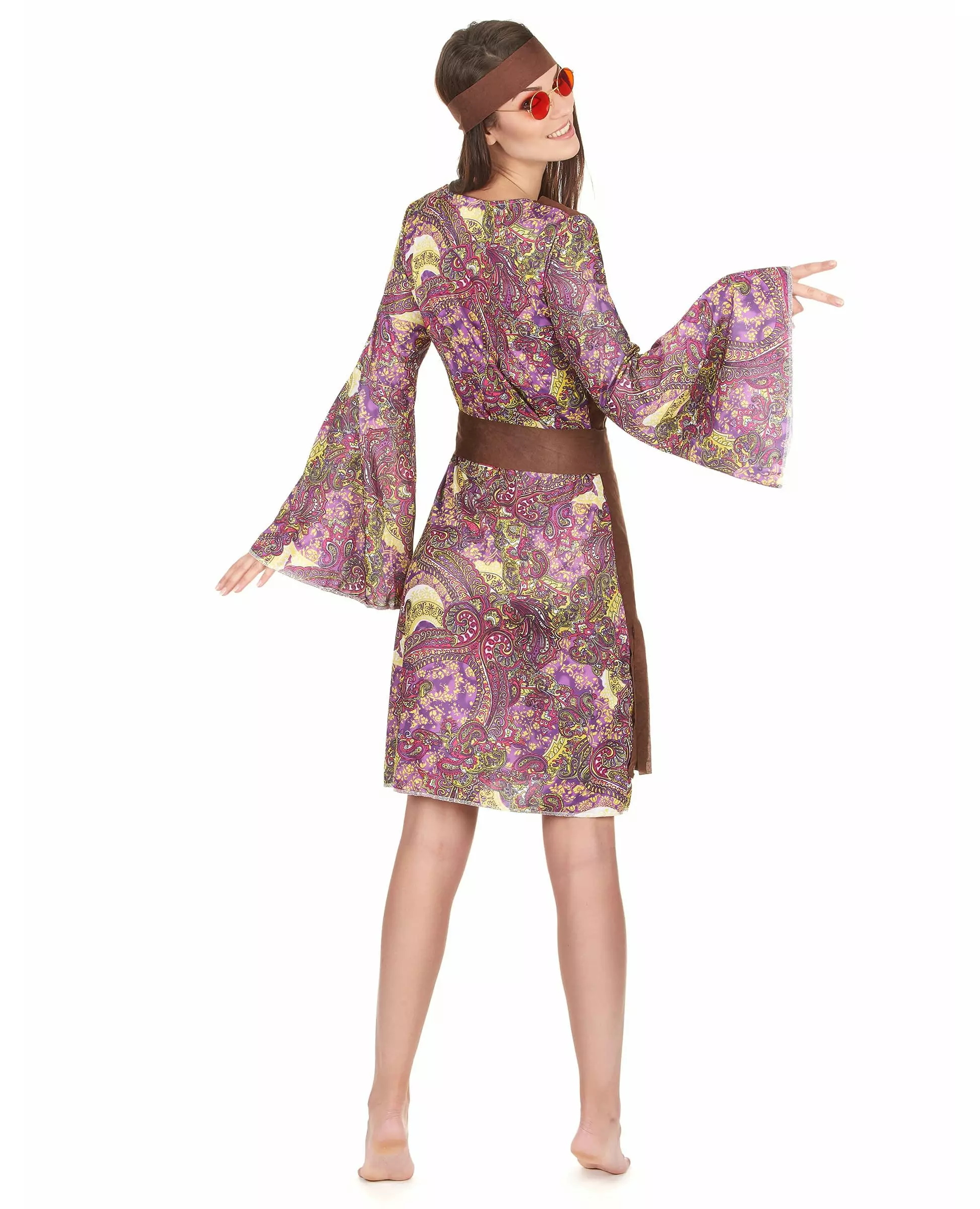 trendy hippie! This hippie costume for women consists of a dress, a headband, and a belt (others not included). The dress is mid-length and has long, flared sleeves. The print is a paisley pattern with a dominant pink color. Sewn directly onto it (only on the front) is a brown felt fringed vest. Thanks to the brown belt, you can cinch your waist with a simple knot. Finally, the headband will accessorize all your hairstyles. It is also brown. You will be perfect for a costume day with this costume worthy of the "Baba Cool" years. Accessories included: Dress with vest Headband Belt Material: 100% Polyester Care: Hand washable
