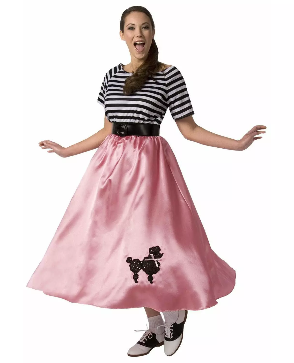Revive the beginning of rock 'n' roll This 50s costume for women consists of a long dress and a belt. The top is black and white striped. The skirt is pink satin and a poodle is printed on the bottom of the outfit. The belt is black and also accessorizes this costume. This costume will be ideal for your costume parties or themed parties to bring the 50s to life through you!. Accessories included: Dress Belt Material: 100% polyester Care: Hand wash