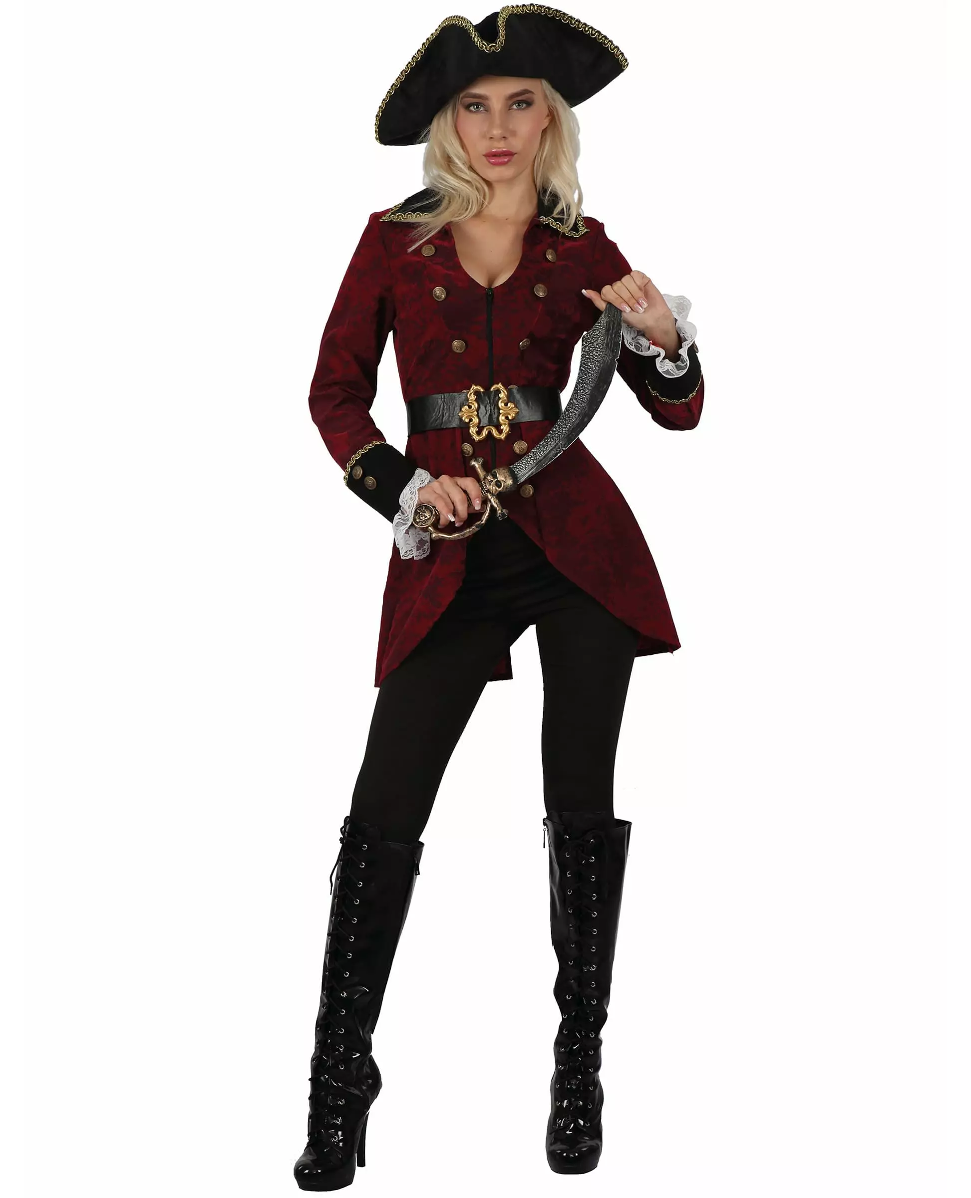 All aboard! This pirate costume for women includes a jacket, a belt and a hat (stockings, sword and boots not included). The pirate jacket is red with gold buttons, the sleeve collars are black. It is longer at the back than at the front. A pretty black belt with a gold buckle will mark your waist while keeping the jacket securely closed. A black hat with gold trim will complete this pirate costume! This costume will be perfect for a fancy dress party or for the Carnival! Accessories included: Jacket Belt Hat Material: Polyester Care: Hand wash