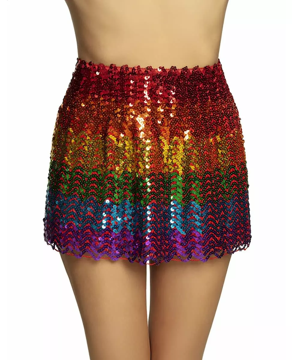 Dare to wear sequins and bright colors for Carnival! This rainbow skirt is for women. This short skirt is sequined and will be comfortable to wear thanks to its elastic waistband. For your next disco-themed party or for Carnival, opt for this sublime rainbow sequin skirt! Accessories included: Skirt Material: 50% polyester, 50% polyethylene Care: Hand wash