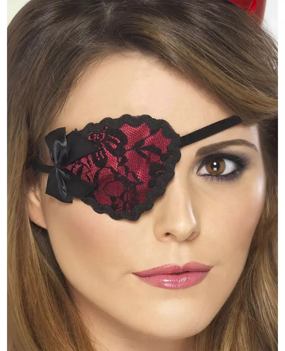 Embody a female pirate with this lace-covered eye patch. This women's pirate eye patch is burgundy in color, in a satin fabric, covered with black lace. A small black bow is also present on the side. The black ties are tied around the head and ensure the eye patch stays in place. This eye patch is positioned over the right eye. This accessory will complete your pirate costume with femininity during a costume party or for Carnival. Accessories included: Eye patch