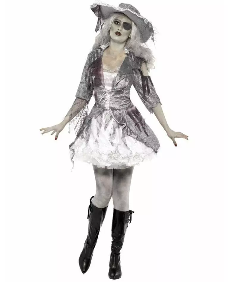 Play as a ghost pirate on Halloween night! This magnificent pirate ghost costume for women consists of a dress and a hat (boots not included). Made of gray imitation velvet, it will be very comfortable to wear. This costume gives the impression that the white satin-effect dress is accessorized with the gray jacket. It has a petticoat sewn to the dress that will add volume to the whole. Decorated with lace and silver embroidery, it will be laced up the front with matching laces. Finally, a matching hat will accessorize your costume. This costume will be perfect for your Halloween parties! Accessories included: Dress Hat Material: 100% Polyester Care: Hand wash
