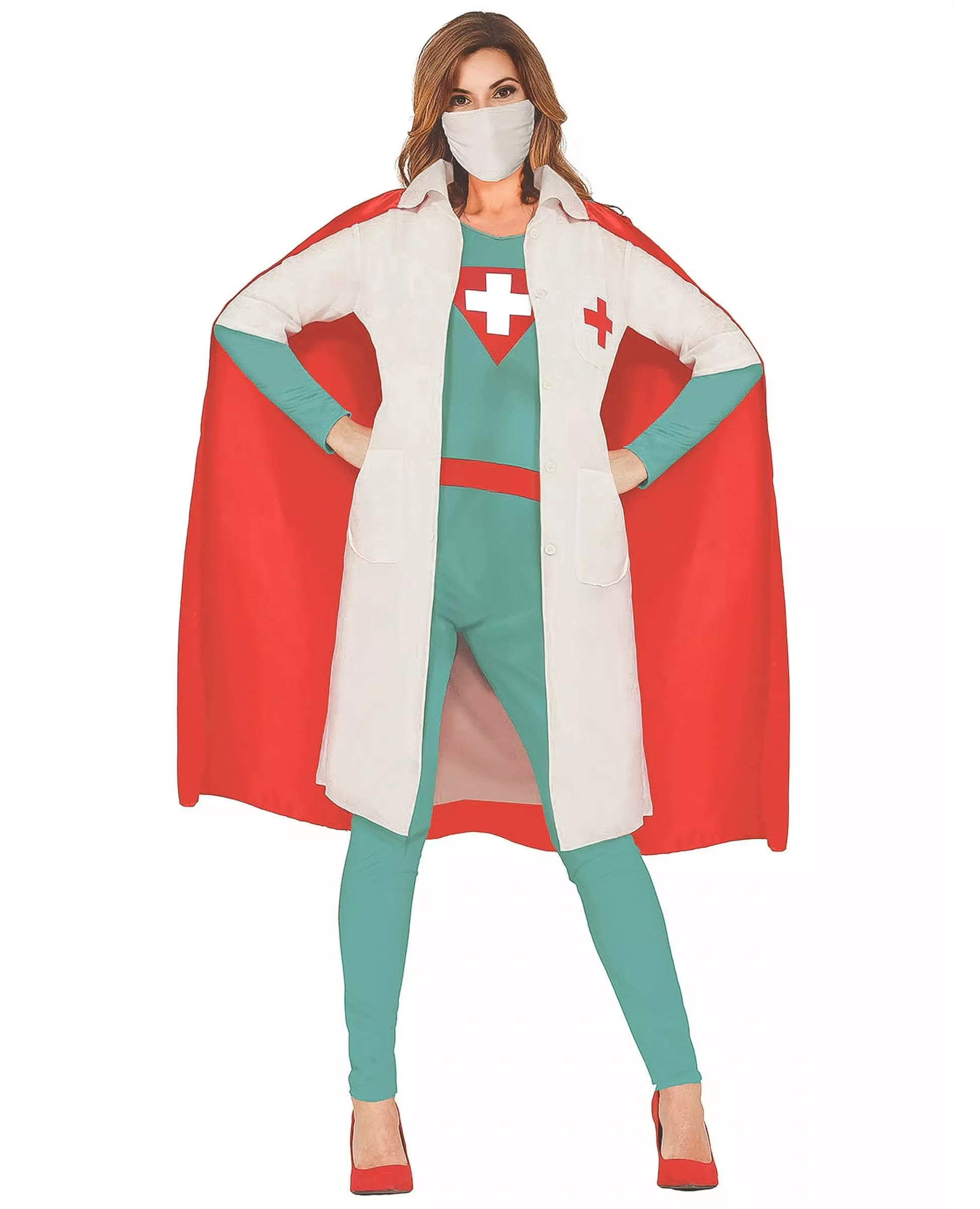 Hello doctor! This super doctor costume is for women and consists of a mask, a jumpsuit, a blouse, and a cape. The jumpsuit is entirely blue with a red band at the waist. It is decorated with the medical symbol: a white cross in a red triangle. The blouse is white and has short sleeves. It has a red cross on the chest. The red cape is added over the blouse. Finally, the costume also contains a white mask. It has two elastic bands to hold it behind the ears. This super doctor costume will be perfect for a superhero-themed party! Material: 100% POLYESTER. Accessories included: Mask Jumpsuit Blouse Cape Care: Hand wash