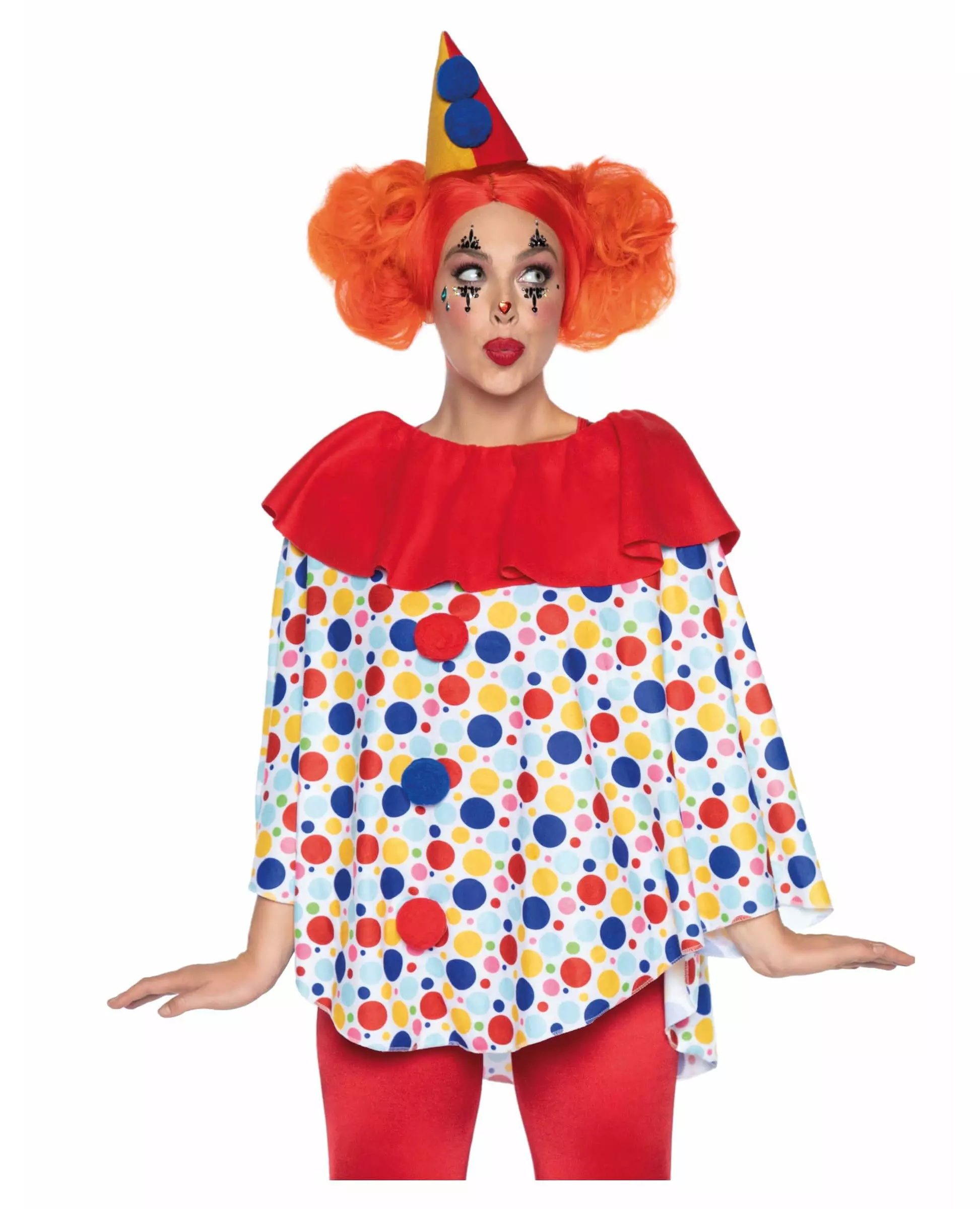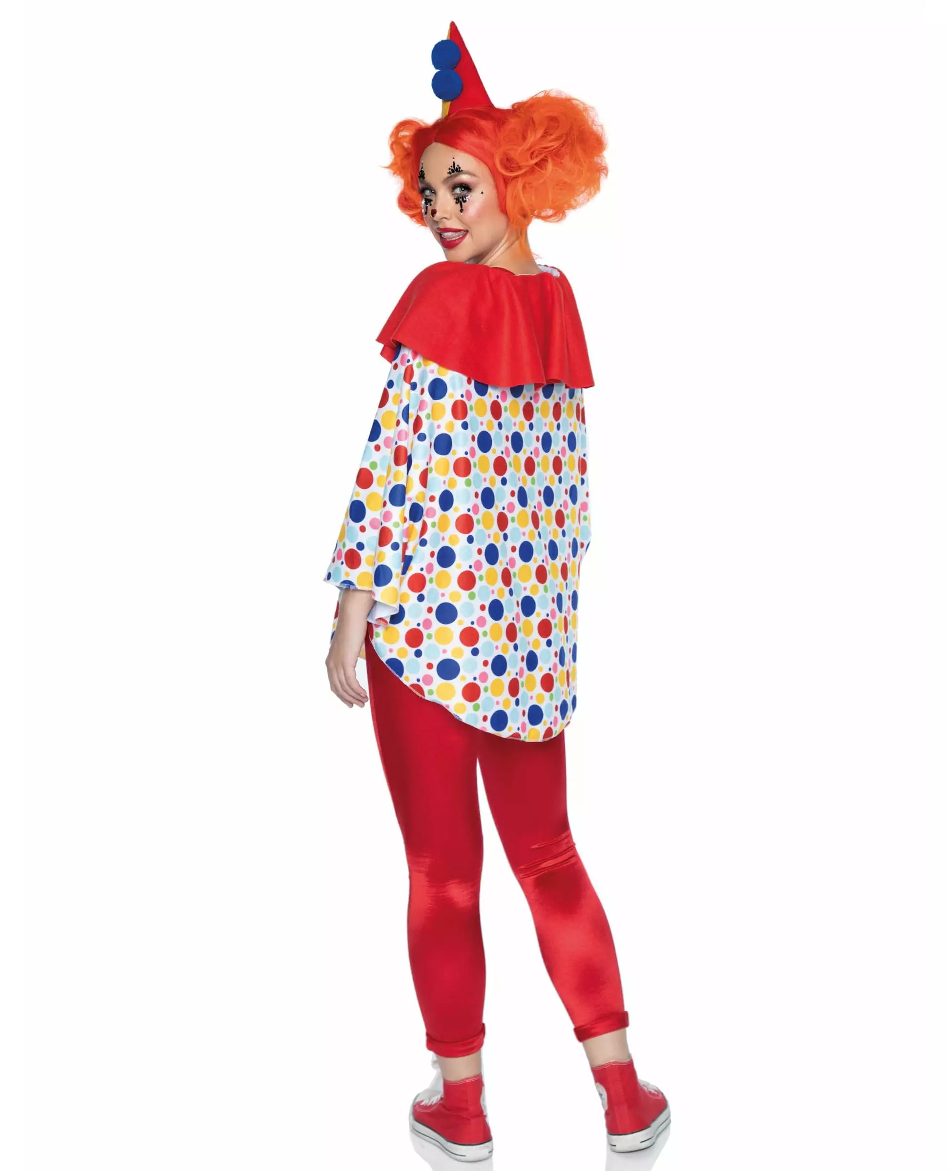 tunic to embody a real clown! This outfit is for women. It consists of the tunic and the hat. The multicolored tunic is composed of round patterns and a wide red collar. The clown hat is pointed and also multicolored. This clown outfit will be perfect for all your festive events! Accessories included - Tunic - Hat