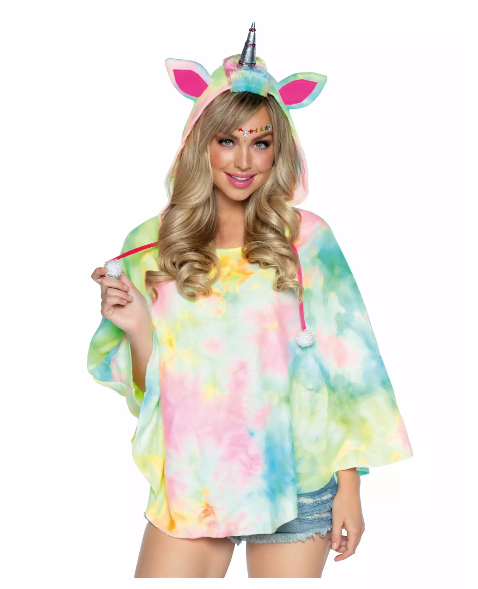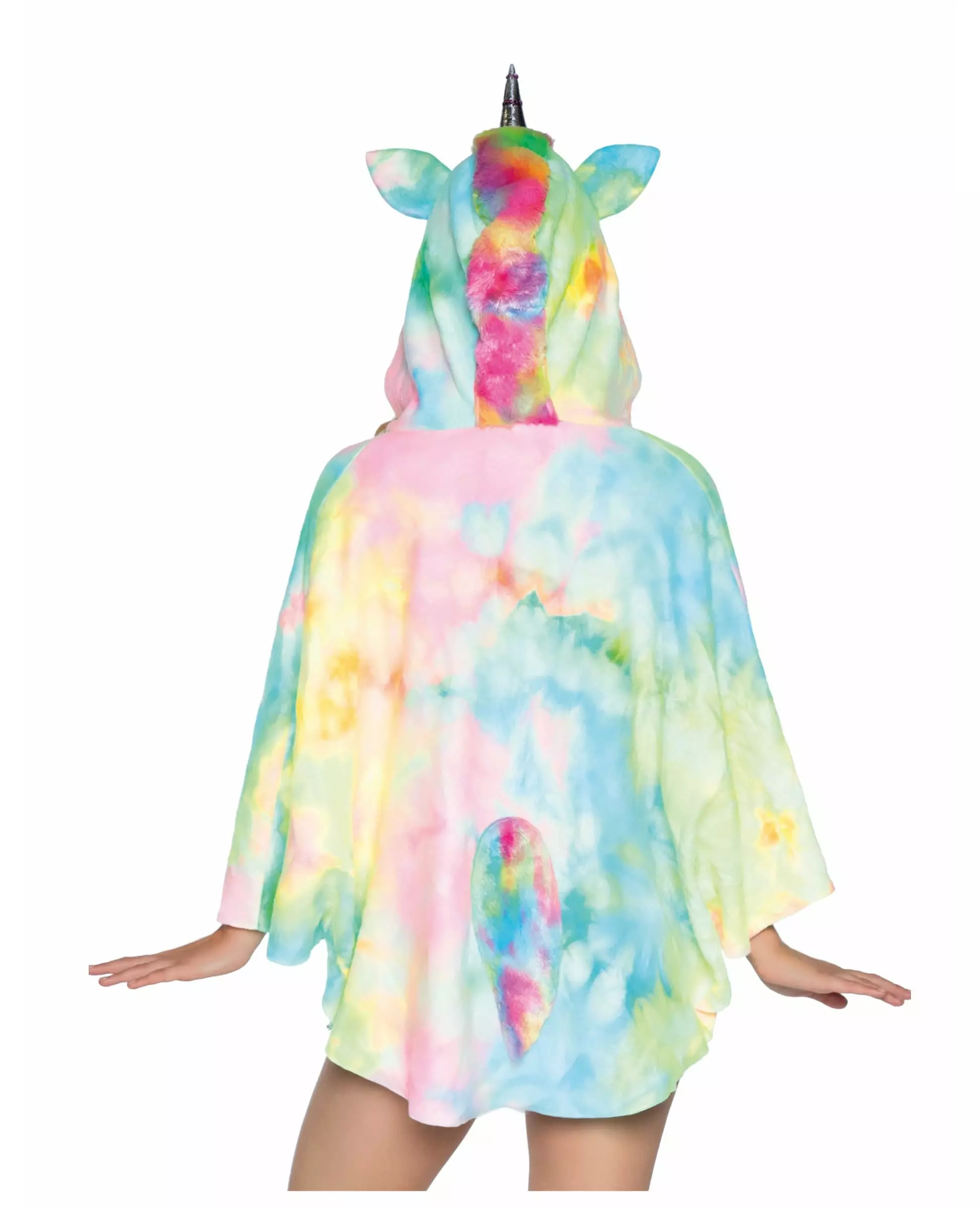 colorful unicorn! This unicorn tunic is for women. This tunic, decorated with several colors in tie and dye, consists of a unicorn tail sewn to the back as well as a hood. The hood has two small ears as well as a silver unicorn horn. This outfit will be perfect to complete your unicorn costume!. Accessories included: Cape with hood Material: 100% polyester Care: Hand wash