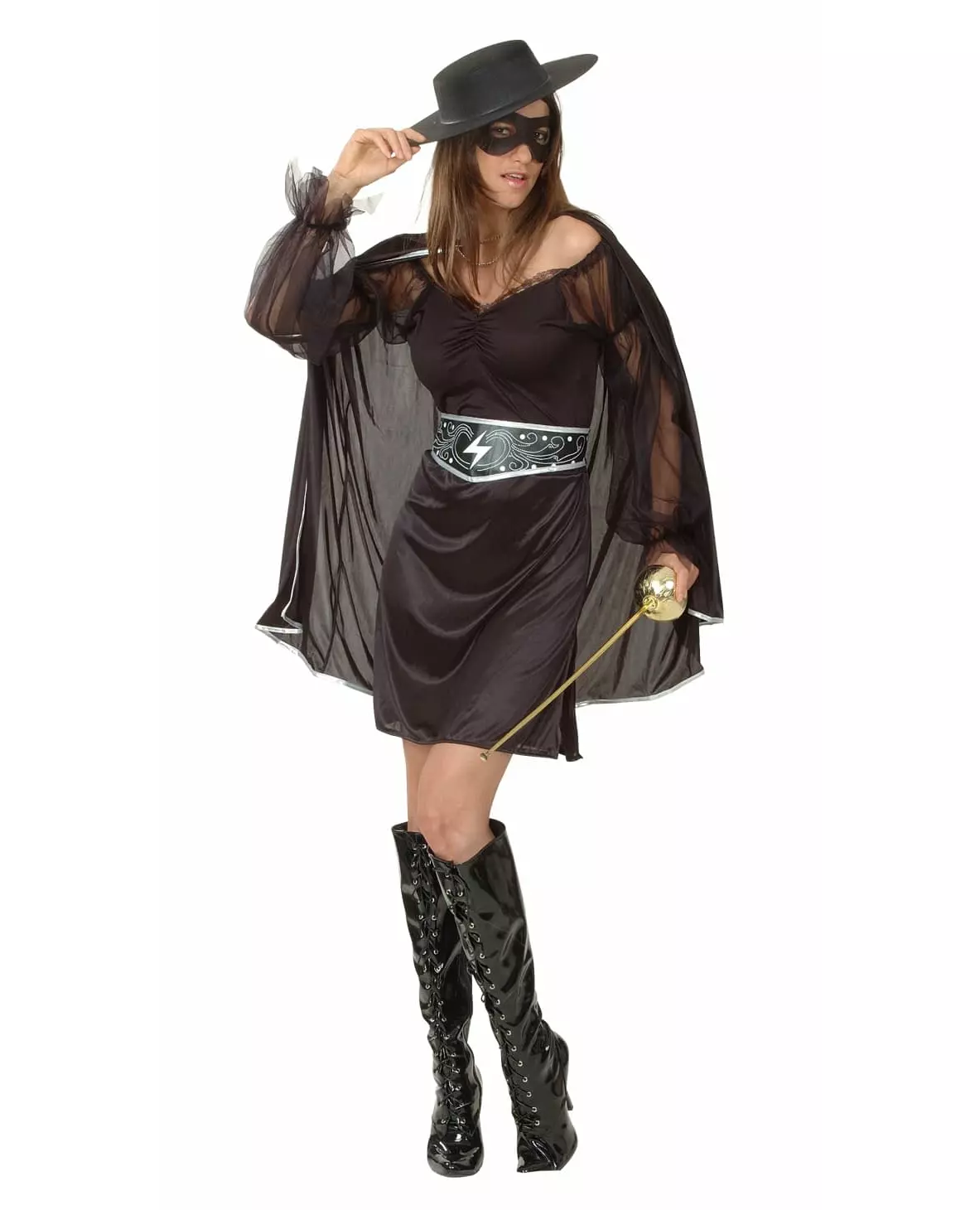 Flexible costume! This masked vigilante costume for women consists of a hat, a mask, a dress, a belt, and a cape (sword and boots not included). The black dress is short and made of shiny fabric. The sleeves are long and made of tulle. The hat is rigid and covered in black felt. Its head circumference is approximately 60 cm. The belt has a Velcro fastener in the back and will be ideal for cinching your waist. The cape will simply rest on your shoulders. With a silver border, a chain of the same color is sewn to the front. Finally, the mask is made of felt and will be tie at the back of your head. This costume is perfectly suited to become the companion of the masked hero during your fancy dress or theme parties. Accessories included: Dress Hat Mask Belt Cape Material: 100% Polyester Care: Hand wash