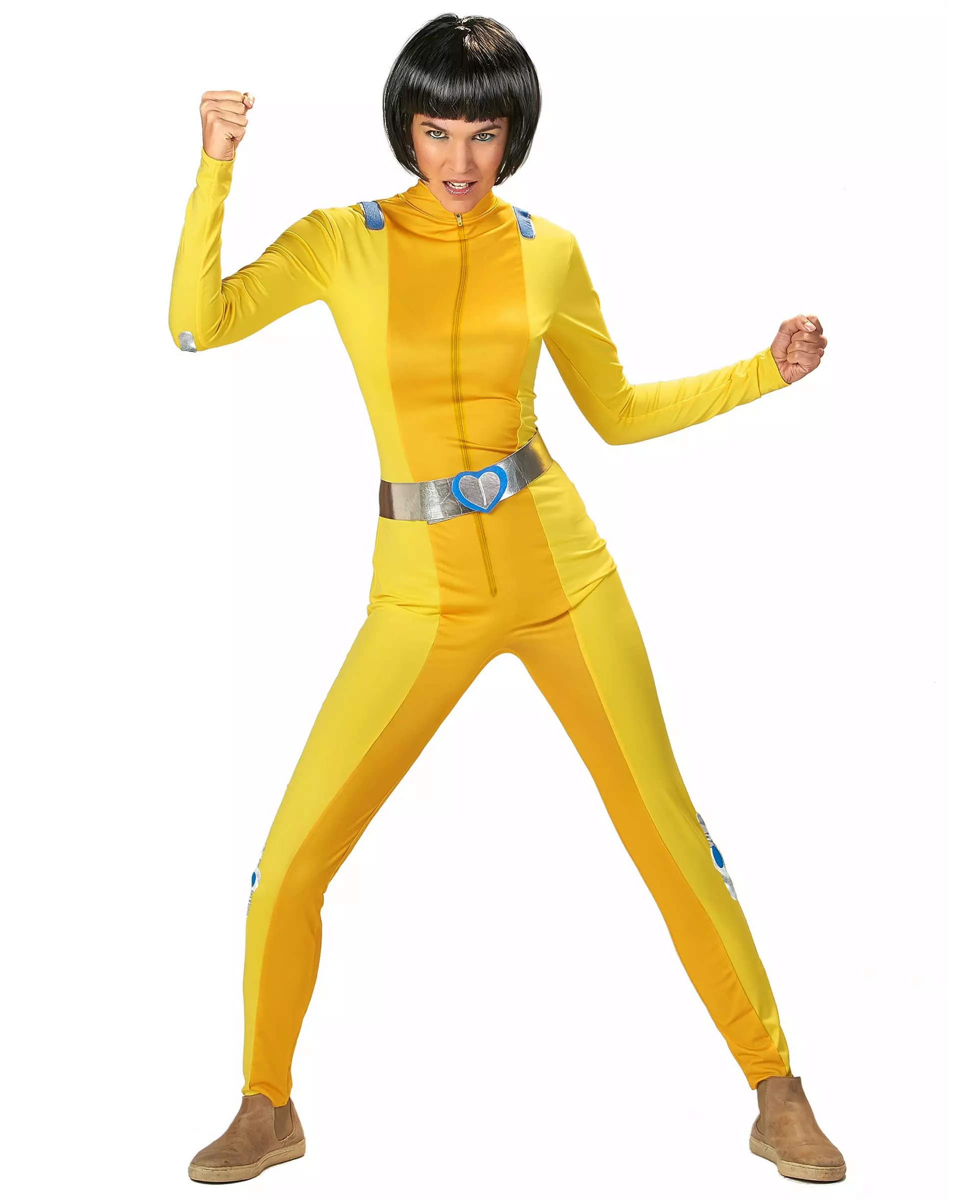 Finally embody your favorite cartoon heroine This yellow shock spy costume consists of a jumpsuit and a belt. The jumpsuit is yellow, with a darker stripe in the center. At the shoulders, elbows and knees, it is decorated with silver and blue details. This jumpsuit closes at the front with a zip. The belt is silver with a heart in the middle. It closes with Velcro. This costume will be perfect for forming a trio of spies with your friends worthy of your childhood heroines. Accessories included: Jumpsuit Belt Material: 100% Polyester Care: Hand wash
