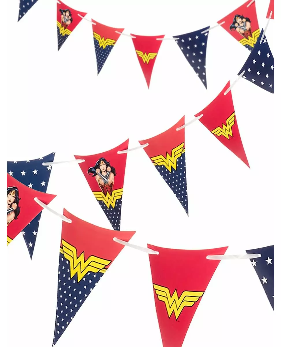 Wonder Woman in the air! This bunting is officially licensed by Wonder Woman™. Made of cardboard, it measures 2m in length. It includes the image of Wonder Woman and her logo on the pennants. You can decorate your room with this garland for a Wonder Woman™ birthday!. Accessories included: Garland of 8 pennants Material: Cardboard Care: Do not wash