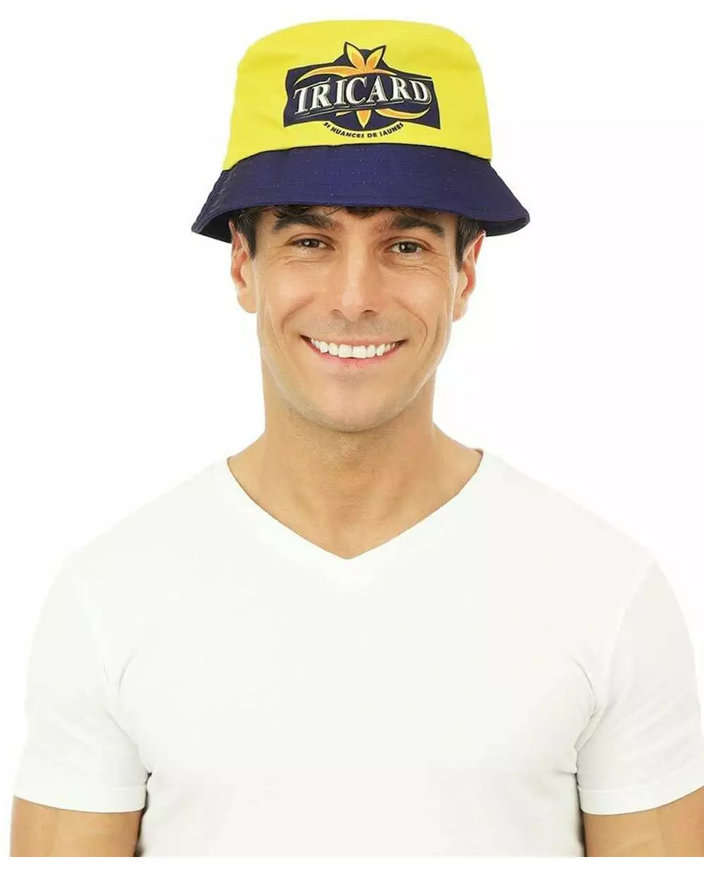 Humor in the sun! This yellow and navy blue bucket hat for men proudly displays the inscription “Tricard” on the front, in a style inspired by well-known drink logos. With its bright colors and fun design, this quirky bucket hat is perfect for showing off your irony during an aperitif with friends. Ideal for a stag party, a summer party or a barbecue, it will add a fun and relaxed touch to your outfit. Accessories included: 1 Bucket hat