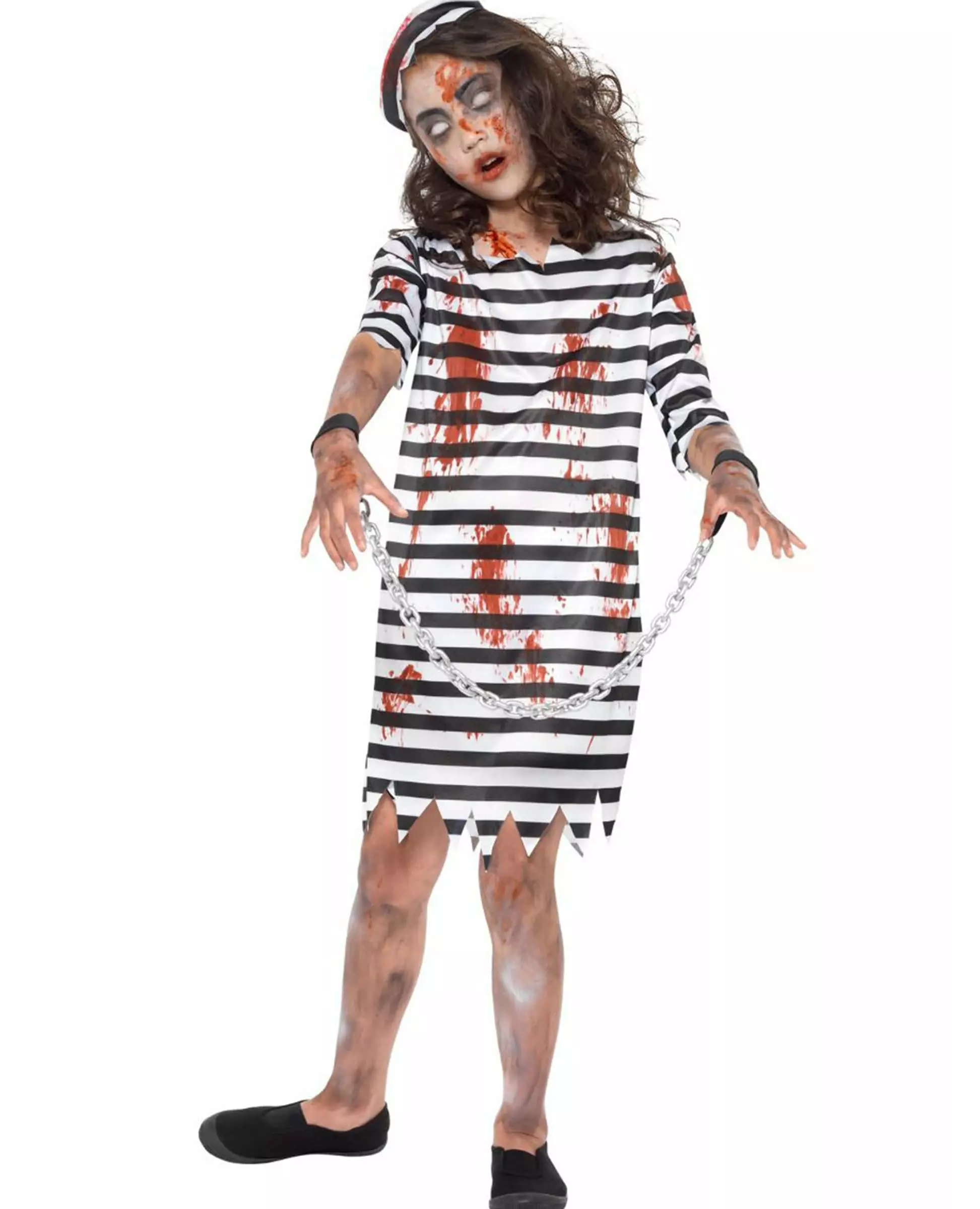 The most dangerous zombie! This chained zombie prisoner costume for girls includes a headpiece, a dress, and a chain. The dress is short and cut into points for a torn look. It is white with horizontal black stripes. The dress is also stained with blood for added realism. The headpiece is a prisoner's cap that matches the dress. Finally, a gray chain connected to links is included to complete this zombie prisoner uniform. This complete zombie prisoner girl costume will be perfect for terrifying everyone this Halloween. Accessories included: Dress Headpiece Handcuffs with chain Material: 100% polyester Care: Hand wash