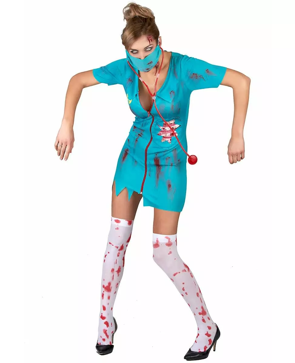 No more pulse, no doubt about it! This zombie nurse costume for women includes a dress and a mask. (stethoscope, shoes, stockings, and fake blood not included). The turquoise blue dress is very short and closes at the front with a red zipper: you can thus adapt the neckline to your liking. A soft plastic mold representing broken ribs is sewn at the top of the abdomen. The costume is delivered without the fake blood stains, but you can recreate this effect with a fake blood spray for textiles available on our online store. The mask, also covered in fake blood, is made of soft fabric and will be held to the ears by two white elastics. This costume will not fail to particularly worry your friends who are already not very fond of visits to the doctor, during a Halloween evening. Tip: As this dress is very short, we recommend wearing leggings or opaque tights underneath. Accessories included: Dress Mask Material: 100% Polyester Care: Hand washable
