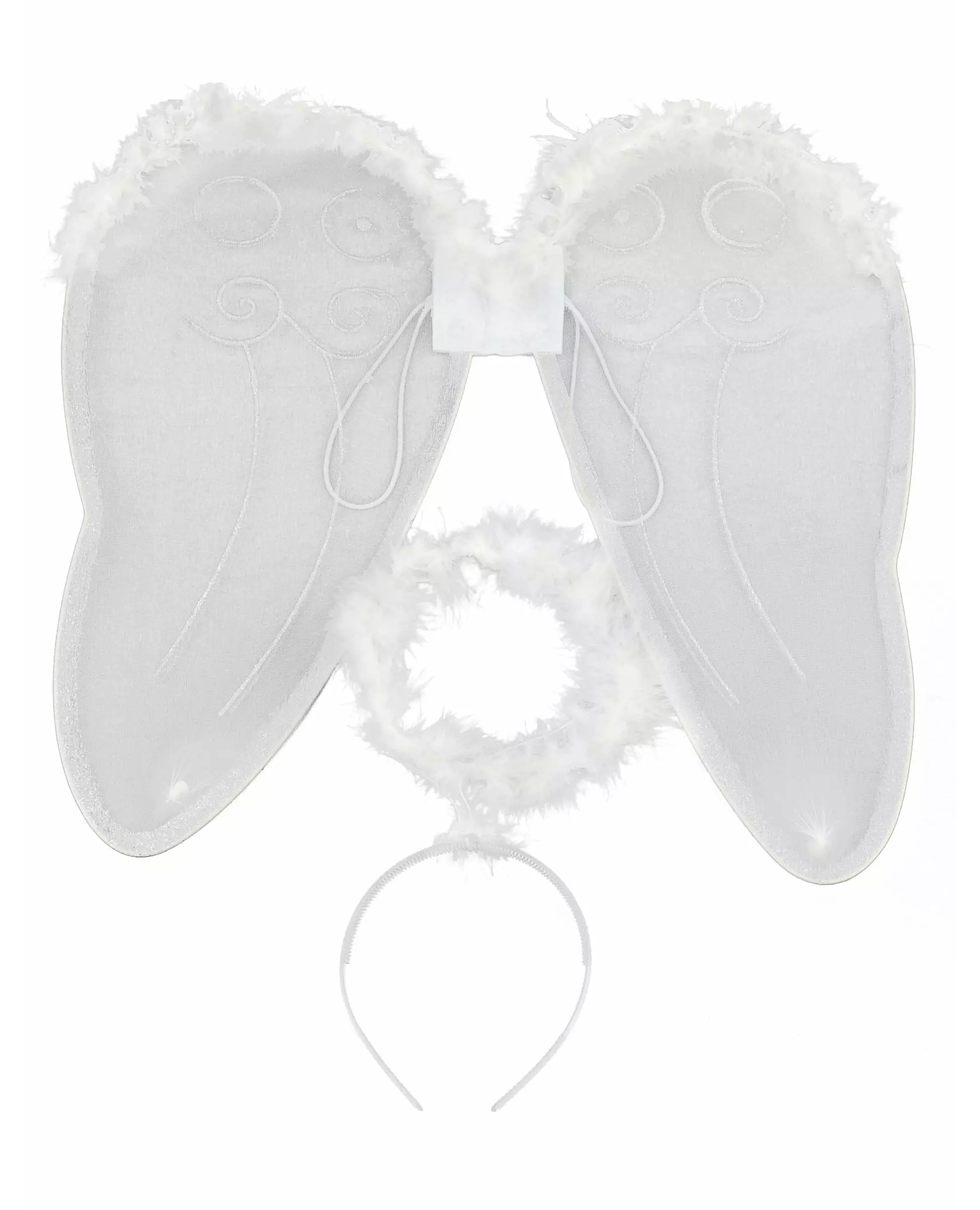 Engleaktig! Dette hvite englesettet for voksne består av et par vinger og en glorie. Vingene er laget av hvitt stoff med sølvpaljetter og hvite fjær rundt vingene. De bæres med elastiske stropper. Glorien er laget av hvite, luftige fjær. Den er festet til et pannebånd. Dette englesettet vil være ideelt for å fullføre englekostymet ditt, under en engel- og demontemafest eller til karneval. Inkludert tilbehør: Pannebåndvinger