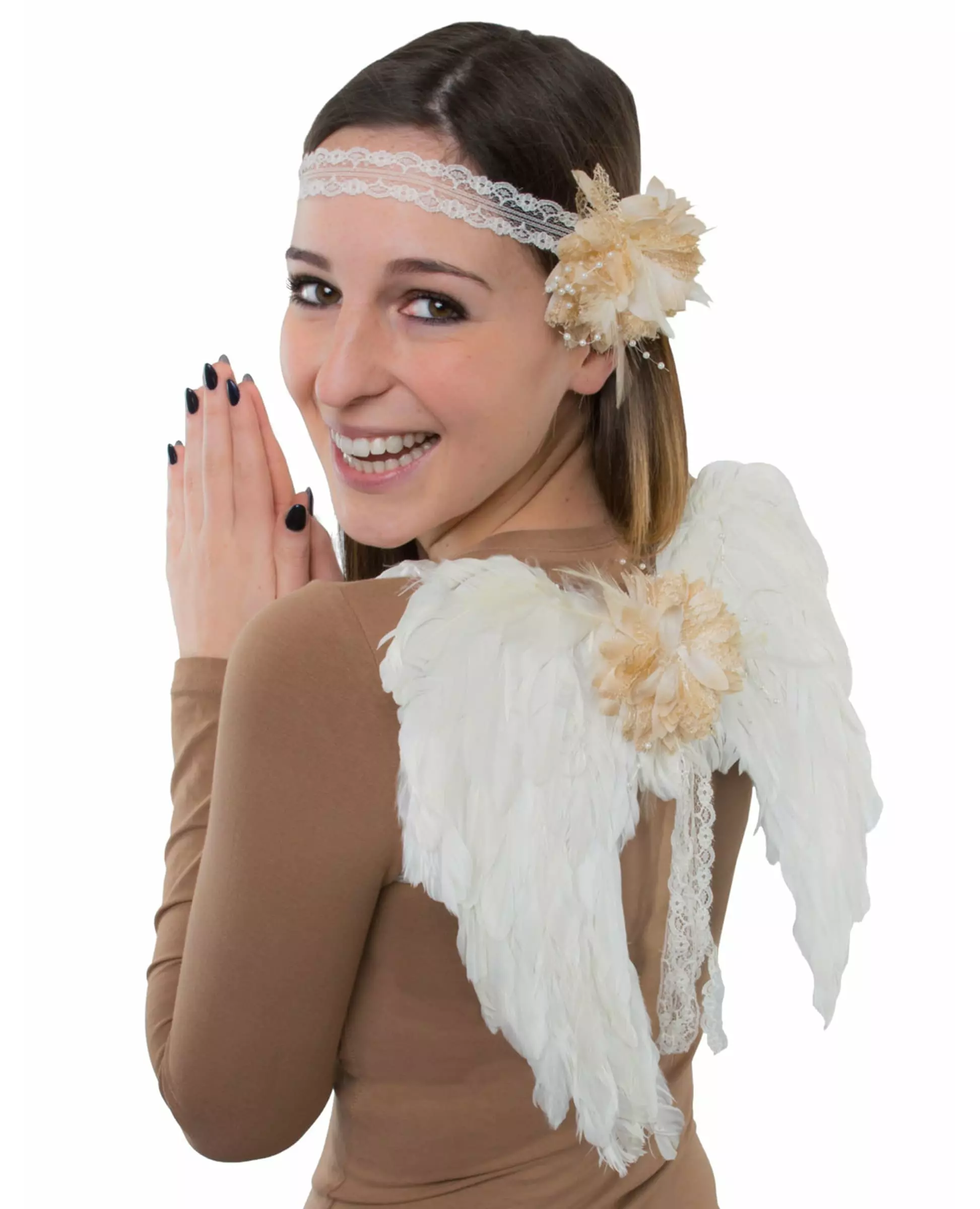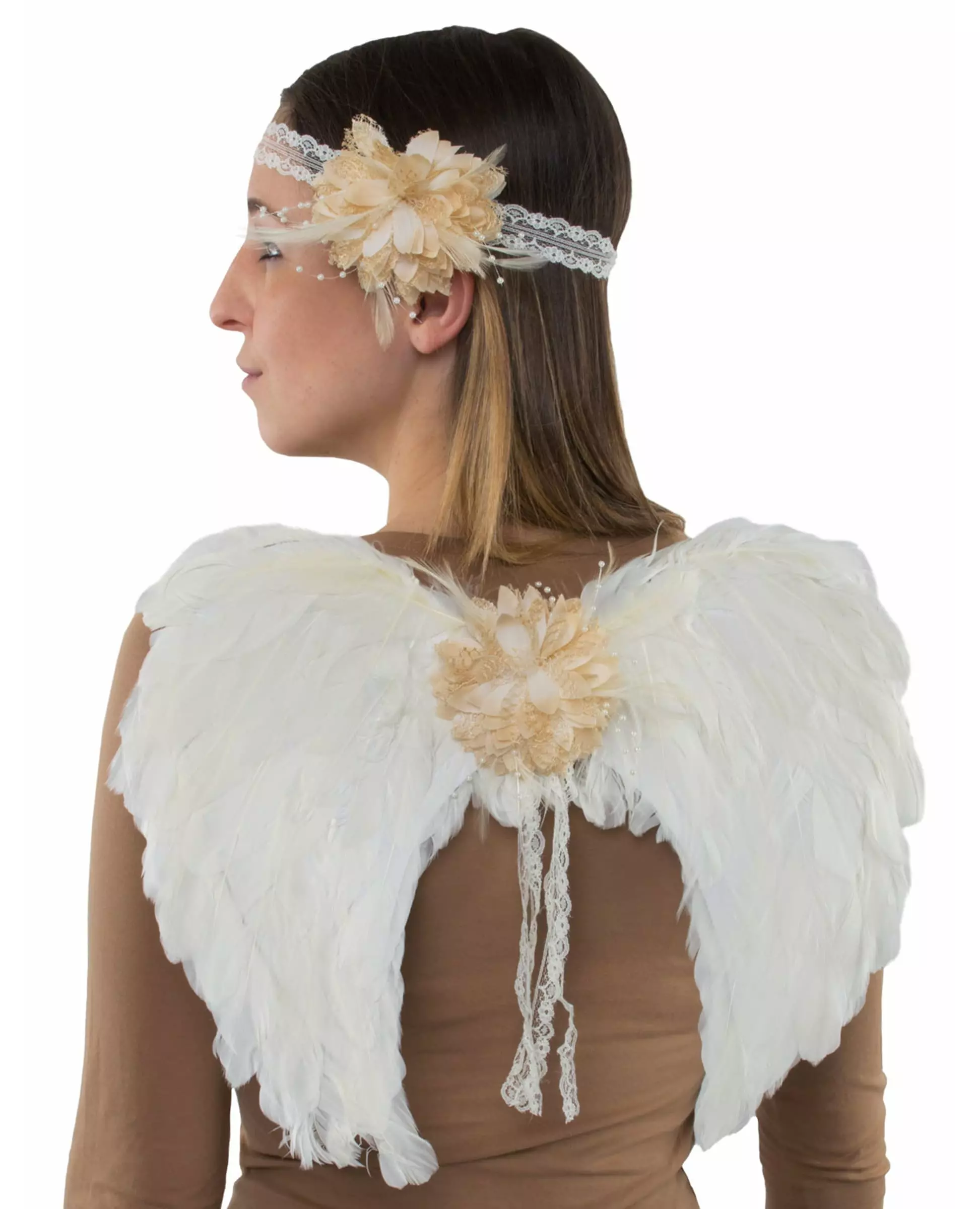 En engel til karneval! Dette settet inkluderer et voksensett. I dette settet finner du englevinger og et pannebånd som matcher vingene. Du finner en liten elfenbensfarget blomst festet til begge tilbehørene. Dette settet vil være perfekt for å fullføre antrekket ditt til karneval eller til en spesiell engel- og demonfest! Inkludert tilbehør: Englevinger og pannebåndsett