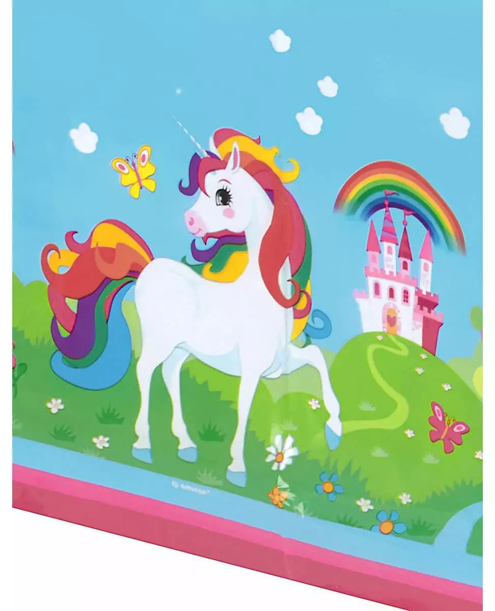 En regnbuebursdag i enhjørningenes land! Denne plastduken måler 180 x 120 cm. Den er trykt med en blå himmel i midten, omgitt av en fargerik enhjørning og et prinsesseslott som en regnbue vakkert utkikk etter. På bursdagsbordet ditt vil denne duken med glede ønske den deilige snacksen din velkommen! Datteren din og vennene hennes vil bli transportert til enhjørningenes land for en morsom bursdagsdag! Inkludert tilbehør: 1 duk Materiale: Plast