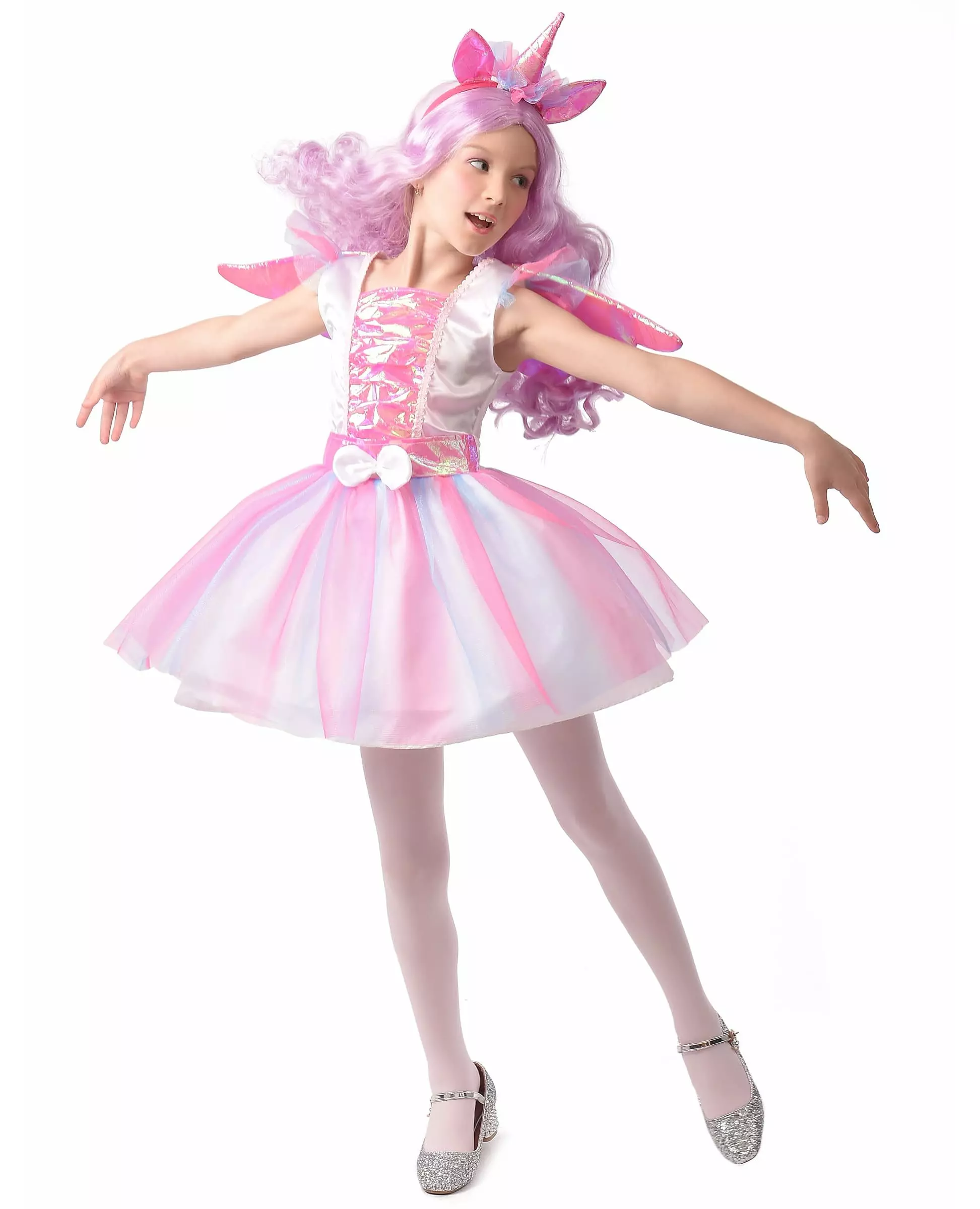 En enhjørning du bare finner i drømmer! Dette enhjørningskostymet er for jenter. Det består av en kjole, et pannebånd og et par vinger (strømpebukser, parykk og sko er ikke inkludert). Kjolen er i to deler: toppen glitrer med en iriserende effekt i midten, og bunnen er formet som en tutu med hvit bakgrunn. Pannebåndet er rosa med små ører og et horn spesifikt for det imaginære dyret, mens vingene fullfører fe-enhjørningslooken. Forvandle barnet ditt til en pen rosa enhjørning til en kostymefest eller til karneval! Inkludert tilbehør: Kjole Pannebånd Vinger Materiale: Polyester Stell: Håndvask