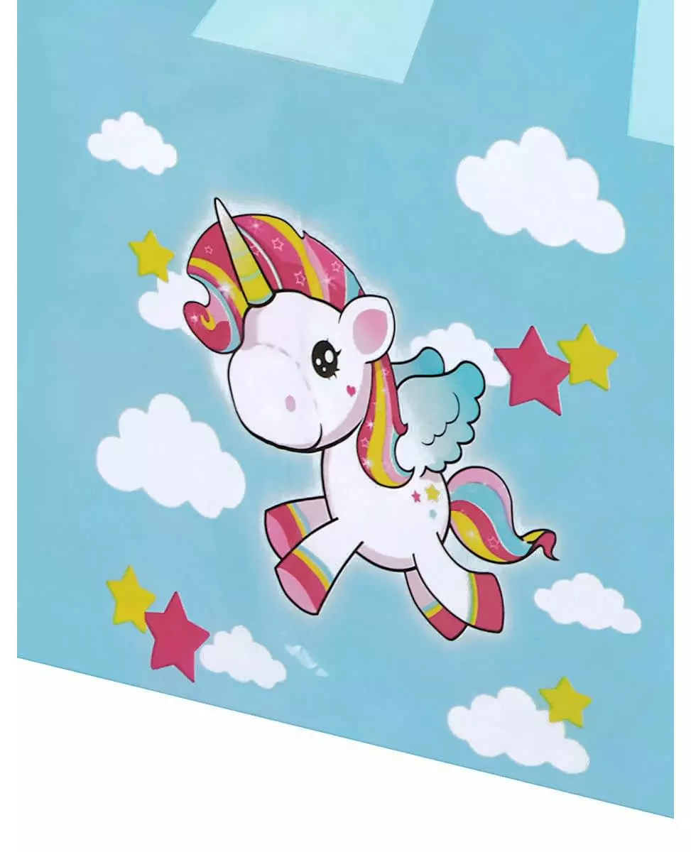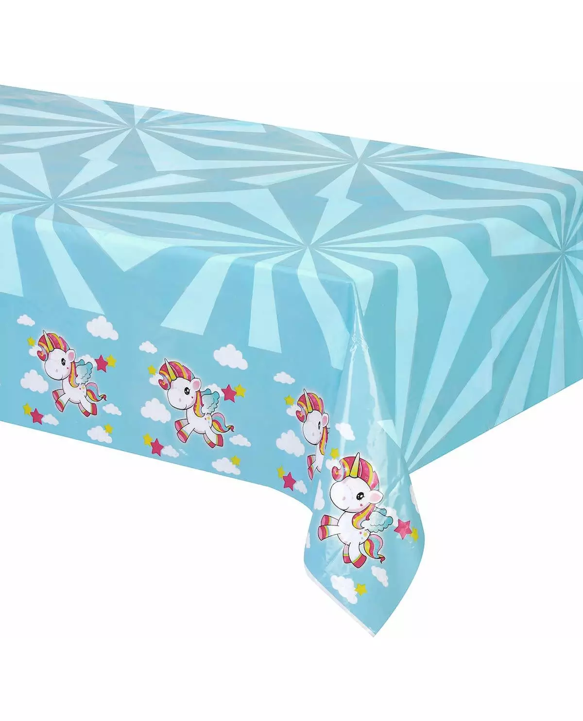 For et perfekt bord! Denne enhjørningsduken er laget av tynn plast. Den måler omtrent 130 x 180 cm. Den er himmelblå i fargen med små enhjørninger trykt på sidene. Enhjørningene er hvite med flerfargede maner og haler, og har vinger på ryggen. De flyr blant små skyer og rosa og gule stjerner. Denne gjenbrukbare duken vil være perfekt for å dekke et fint bord til datterens bursdag!. Inkludert tilbehør: 1 duk Materiale: Plast