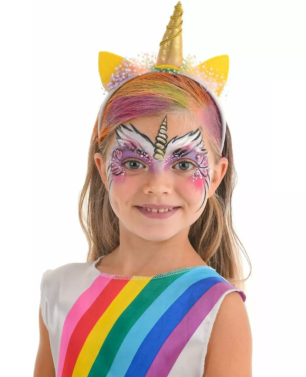 Perfekt sminke for en søt enhjørning! Dette enhjørningssminkesettet er for jenter og består av en gull-, hvit- og lilla sminkepalett, en børste og en svamp. Dette enhjørningssminkesettet vil være perfekt for å forvandle datteren din til en ekte enhjørning til bursdagen hennes eller til karnevalet! Ingredienser: Hvit, gull: INGREDIENSER: Ricinus Communis frøolje, glimmer, glyserylstearat, PEG-100 stearat, paraffinum liquidum, ceteareth-20, sorbitanlaurat, cera Alba, polysorbat 20, fenoksyetanol, sorbinsyre, tokoferol. (+/-): CI 77891, CI 77499, CI 77491, CI 77007, CI 75470, CI 74160, CI 45380, CI 42090, CI 19140, CI 15850, CI 15850. 77891, Glyceryl Stearate, PEG-100 Stearate, Paraffinum Liquidum, Ceteareth-20, Cera Alba, Sorbitan Laurat, Polysorbat 20, CI 15880, Phenoxyethanol, Sorbinsyre, CI42090, Tocopherol. Tilbehør inkludert: 1 sminkepalett 1 svamp 1 børste
