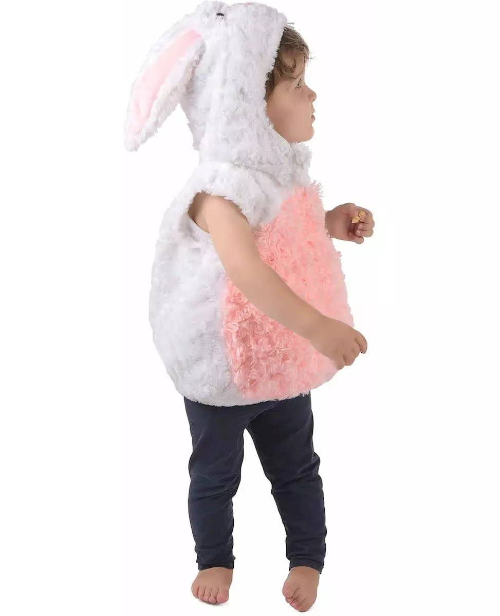 Å, den pene kaninen! Dette hvite kaninkostymet for barn består av en tykk, myk genser som imiterer fuskepels. Hovedsakelig hvit med innslag av rosa på magen og inni ørene, holdes den rundt halsen med borrelås. Den store hetten vil toppe den lille med to store ører. Ideell for eksempel for et første karneval eller for hans første skoleforestilling, denne myke og varme ermeløse genseren vil være perfekt! Tilbehør inkludert: Jumpsuit Materiale: 100 % polyester Stell: Håndvaskbar