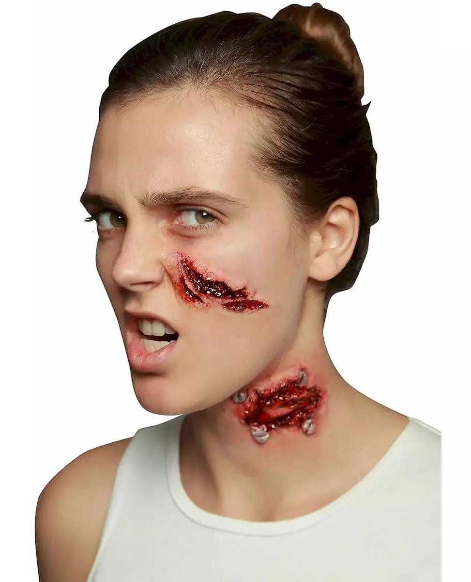 Angrepet midt på natten! Dette falske, dype kuttet er laget av lateks (falskt halssår og lim er ikke inkludert). Det representerer perfekt ferskt rått kjøtt, og vil bli enda mer realistisk med tillegg av falskt blod. Til Halloween, bruk dette falske såret og skrekk dine kjære på en forferdelig kveld!. Inkludert tilbehør: Falskt sår Materiale: 100 % lateks