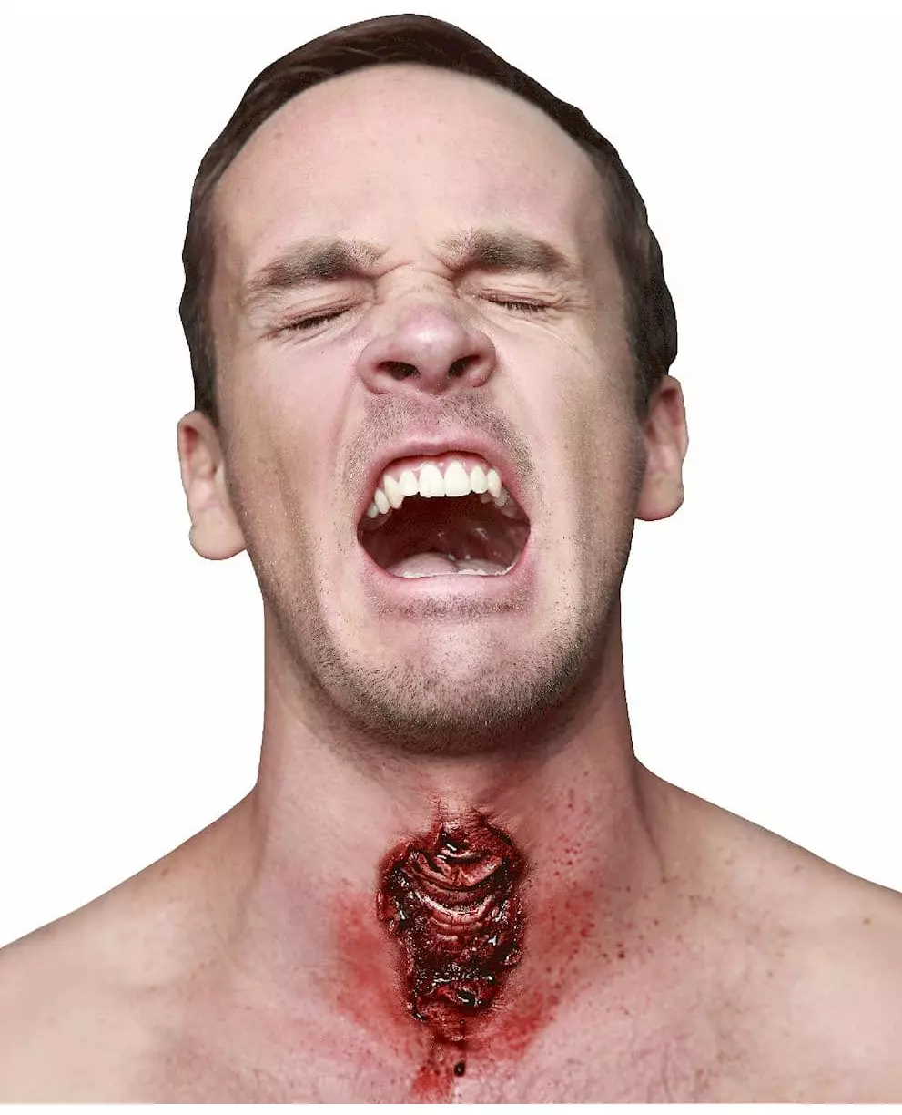 Du kan til og med forandre stemmen din med sår hals! Prøv det! Dette falske såret er designet for voksne og måler omtrent 8,5 x 5,5 cm. Den myke lateksen og de fantastiske detaljene gir utrolig realisme! Såret gir en illusjon av en udekket hals med luftrøret synlig og huden fullstendig avrevet! For et utrolig resultat kan ingenting være enklere: påfør lim eller sminkeviskelær (ikke inkludert) på såret og plasser det på halsen! For en enda mer naturlig effekt, lag konturene med beige og rød kremfargede øyenskygger! Unngå å spise for mye krydret mat, ellers vil luftrøret ditt spille seg ut! Velg godteri på Halloween-festen din! Inkludert tilbehør: Falskt sår Materiale: 100 % lateks