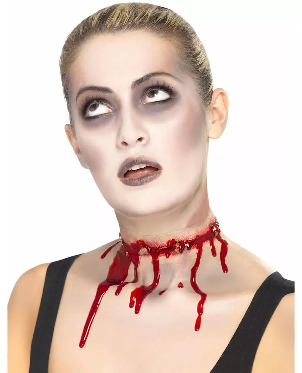 Bli blodig på Halloween-kvelden! Dette falske piggtrådsåret består av en lateksprotese og en tube med lim. Protesen er et sår rundt halsen som ser ut som piggtråd. Tilsett noen dråper falskt blod, og effekten er garantert. Denne sminken vil perfekt fullføre alle dine blodige kostymer på Halloween-kvelden. Inkludert tilbehør: Sårlim