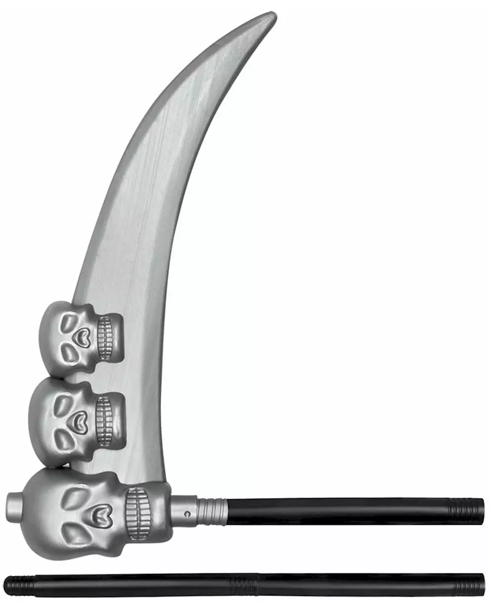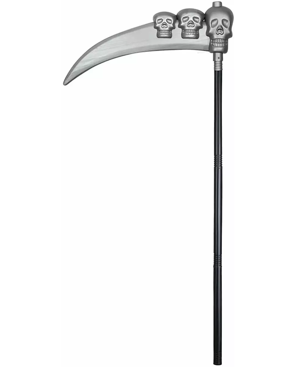 Skarp! Denne hodeskalle-ljåen måler omtrent 103 cm. Den er laget av plast, har et langt svart håndtak og en sølvfarget ljå. Ljåen er dekorert med tre hodeskaller, fra den minste til den største. Denne hodeskalle-ljåen vil være perfekt for å fullføre Grim Reaper-kostymet ditt på Halloween-kvelden. Inkludert tilbehør: Ljå Materiale: Plast Stell: Håndvask