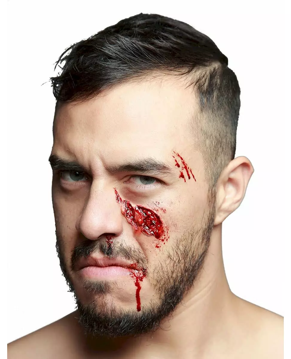 Slag for slag Dette falske såret skal limes på kinnbenet for å simulere en blodig skade (lim ikke inkludert). Laget av lateks, måler det omtrent 6 cm i lengde og 3 cm i bredden. For mer realisme, smink øyet og kinnet med falskt blod og finn på et scenario som forklarer dette slaget. Fullfør Halloween-kostymet ditt med dette falske såret. Inkludert tilbehør: Falskt sår Materiale: 100 % lateks