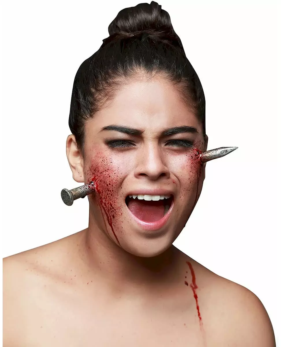 Ups! Gjør-det-selv-verkstedet gikk galt! Dette såret består av to deler av en negl, som hver måler 4 cm. Lateksen og de imponerende detaljene gir en svært realistisk effekt: plassert på hvert kinn, ser det ut til at de to elementene gjennomborer huden og danner en gigantisk negl! For et utrolig resultat er ingenting enklere: påfør lim eller sminkeviskelær (ikke inkludert) på delene og plasser dem på huden! For en enda mer naturlig effekt, lag konturene med beige og røde kremfargede øyenskygger! Ved å leke med verktøy ender du opp med å skade deg selv ... Fortell vennene dine om det på Halloween-kvelden ved å vise frem dette forferdelige såret! Inkludert tilbehør: 2 ender av en negl Materiale: 100 % lateks