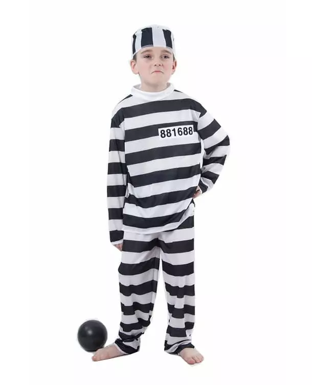Komfortabelt antrekk! Dette fangekostymet for barn består av en langermet elastisk topp med svarte og hvite striper og nummeret 881688 skrevet på brystet. Antrekket inkluderer også elastiske bukser i livet og en matchende hatt (Boulet ikke inkludert). Dette lette og komfortable kostymet vil være ideelt for karneval, et show eller andre utkledningsarrangementer. Inkludert tilbehør: Hatt Topp Bukser Materiale: 100 % polyester Vedlikehold: Renseri