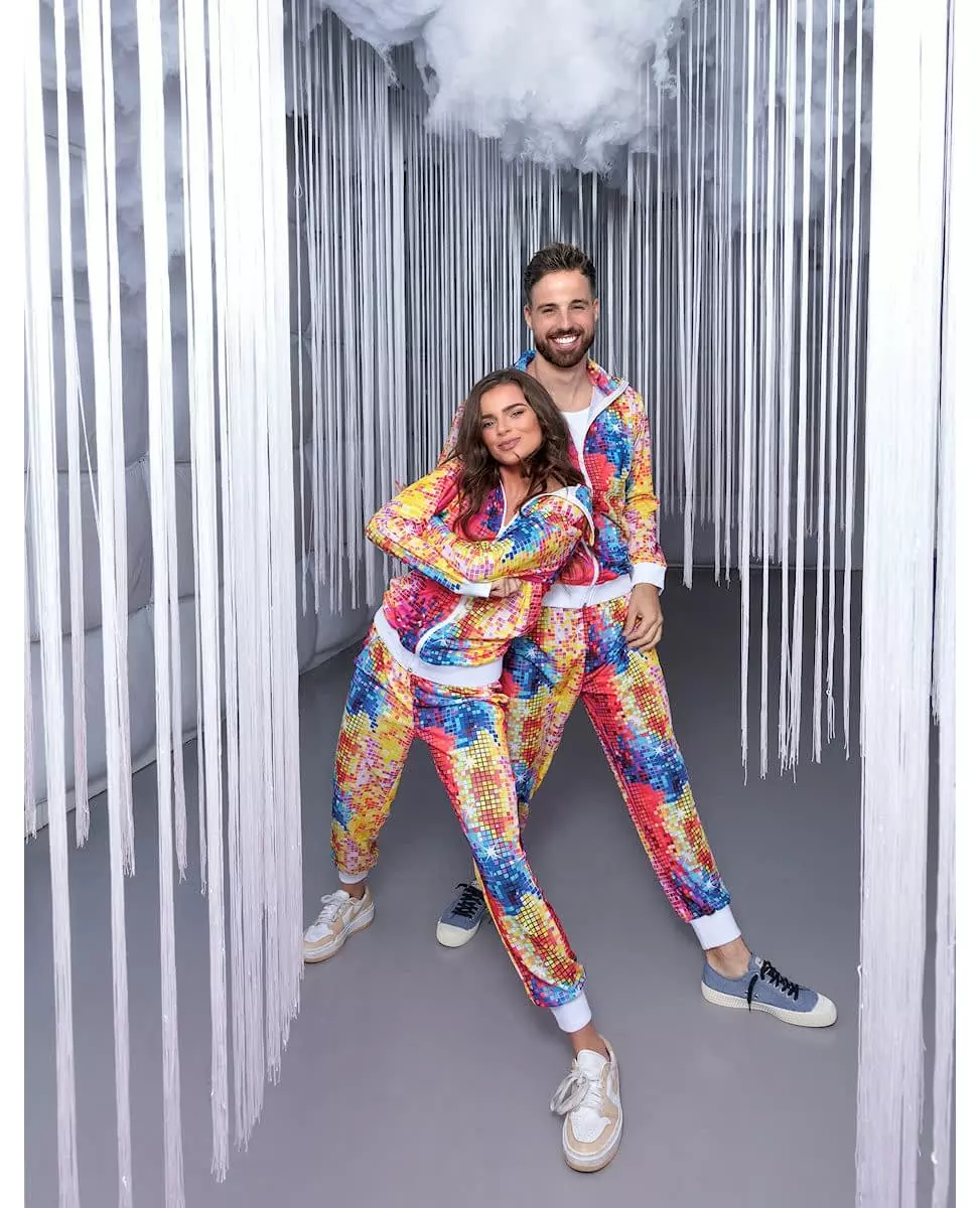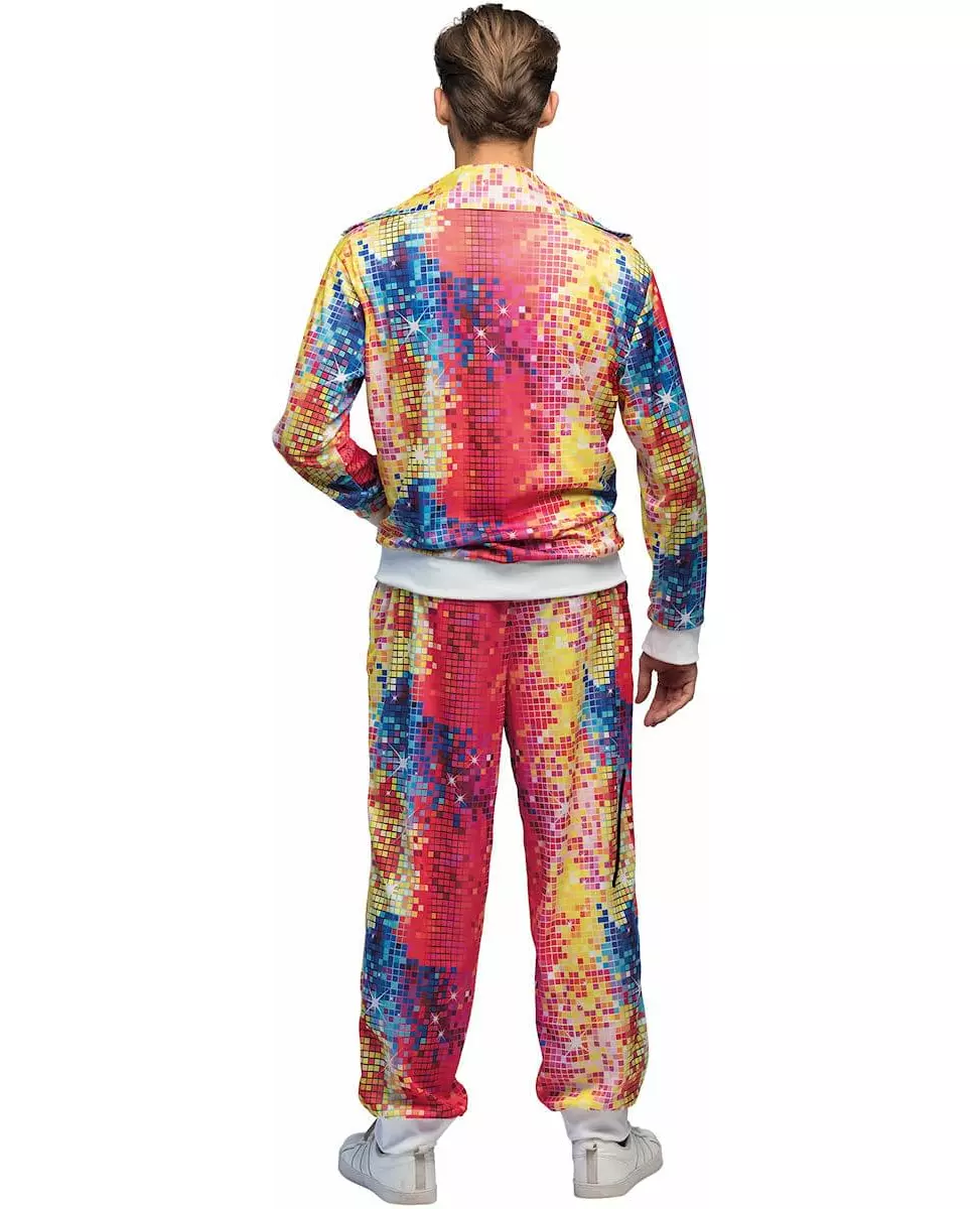Våg å gå ut i farger! Denne disco-treningsdressen er for menn og består av en jakke og bukse med glidelås. Jakken og buksene har et flerfarget trykk med discokuleeffekt. Jakken har en glidelås som gjør at du enkelt kan lukke den. Endene er elastiske og har hvite kanter for et sporty 80-tallsutseende. Våg å bruke den flerfargede discokuleeffekten på discofestene dine! Inkludert tilbehør: Jakke, bukse Materiale: 100 % polyester Vedlikehold: Håndvask
