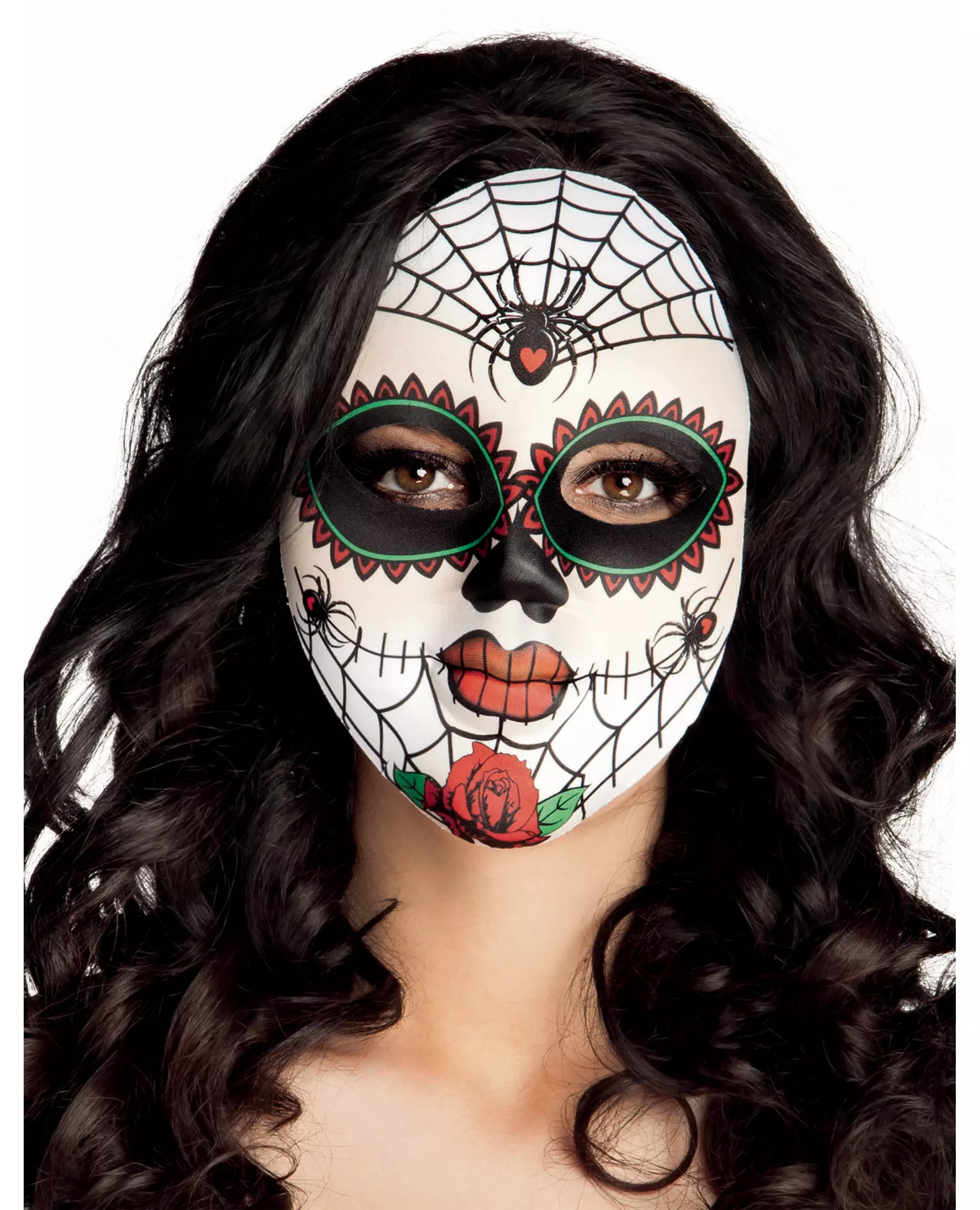 Fargelegg skjelettantrekket ditt! Denne fargerike masken er for voksne. Den er laget av stiv plast og festes til ansiktet ditt med en tynn, svart strikk. Masken er trykt med mønstre av spindelvev, edderkopper og sminke som minner om De dødes dag. Masken vil være behagelig å ha på seg siden interiøret er dekket med et mykt, svart stoff. I tillegg vil hull i nesen gjøre at du kan bruke tilbehøret ditt veldig komfortabelt. Dette tilbehøret vil være essensielt for å fullføre et Doa de los muertos-kostyme på Halloween-kvelden. Inkludert tilbehør: Maske