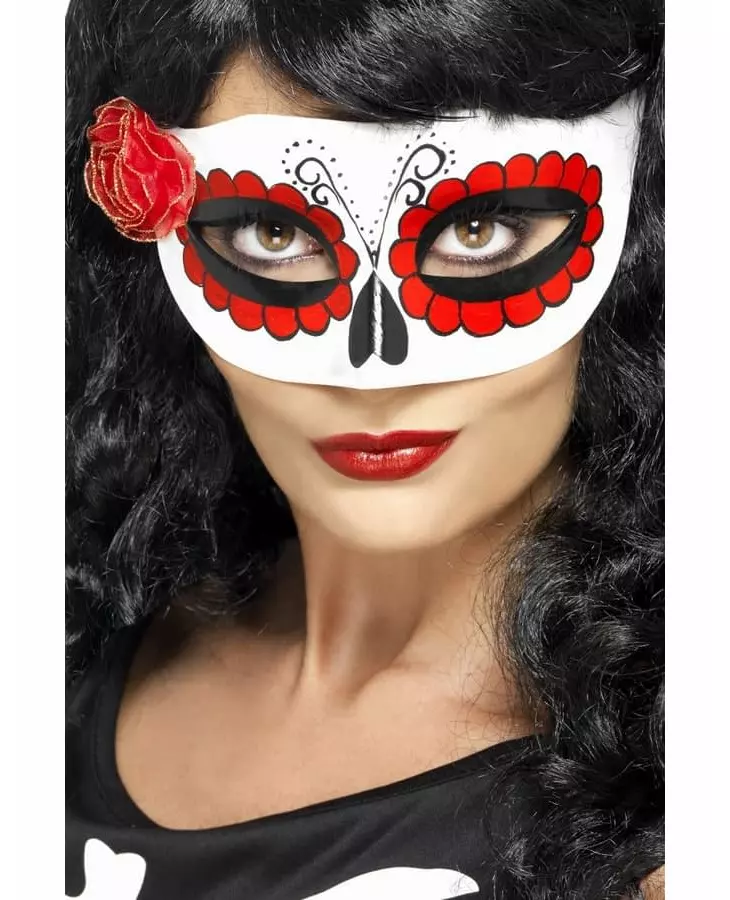 Feir de døde på meksikansk vis! Denne meksikanske ulven i plast er dekorert med motiver som representerer De dødes dag. En liten rød stoffblomst er limt til høyre side av masken. Denne masken vil holde seg på ansiktet ditt med to svarte satengbånd som knytes bak på hodet. Denne masken vil være perfekt for å feire de døde til Halloween eller på en Dia de la Muerte-fest. Inkludert tilbehør: Maske,