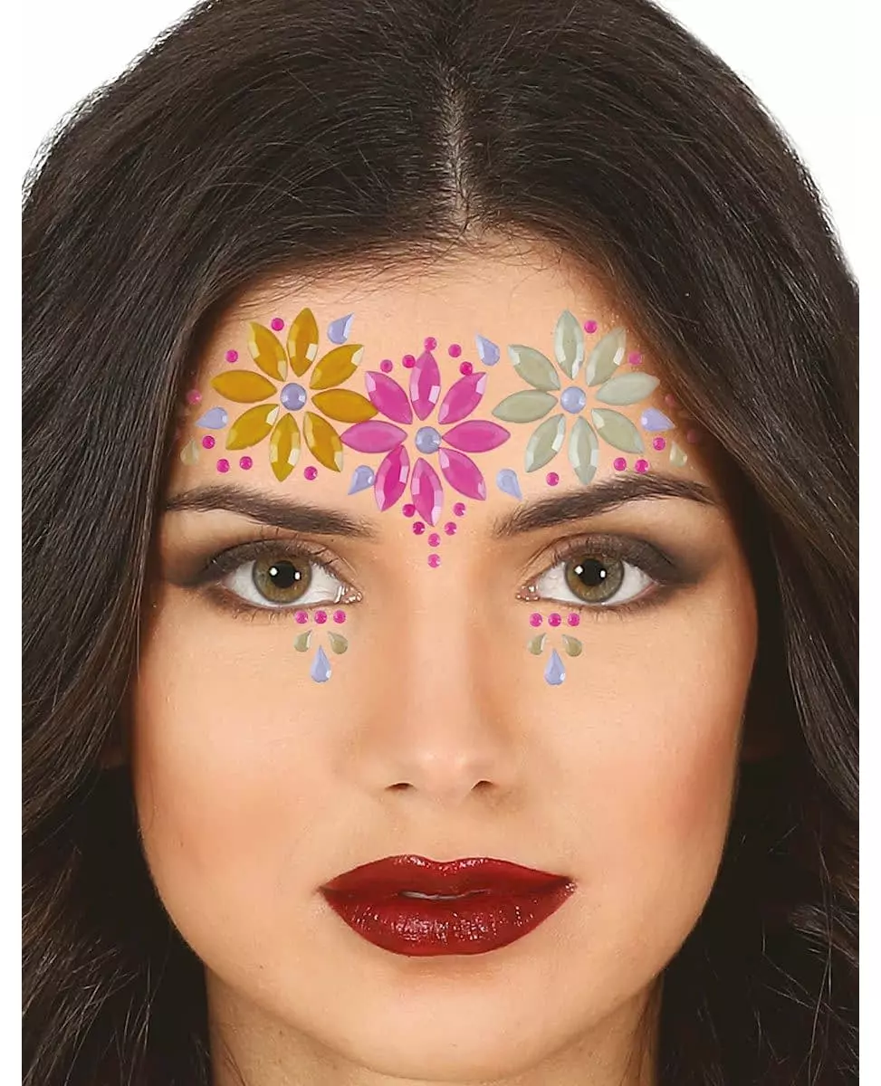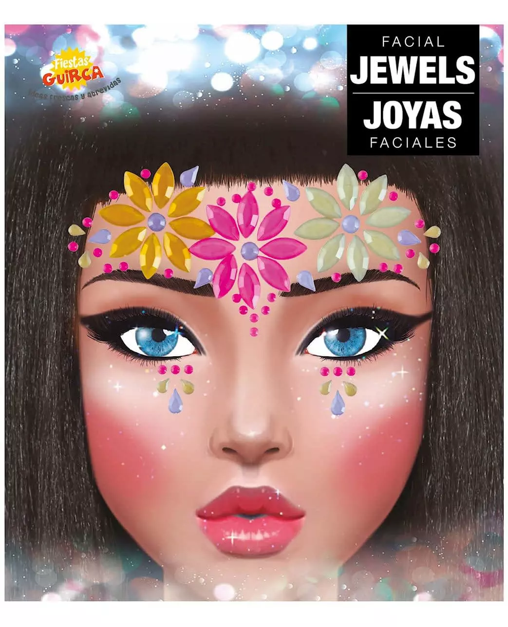 Lys opp antrekket ditt! Dette arket inneholder fargerike blomsterklebende ansiktssmykker. Det inkluderer flere rhinstener i forskjellige former som lar deg lage blomster i forskjellige farger. De vil være perfekte for å gi antrekket ditt et snev av glamour. Disse midlertidige smykkene er ideelle for å fullføre festivalantrekket ditt, en temafest eller enhver anledning der du vil friske opp stilen din med blomsterdetaljer! Ingredienser: NC. Inkludert tilbehør: Klebende smykker