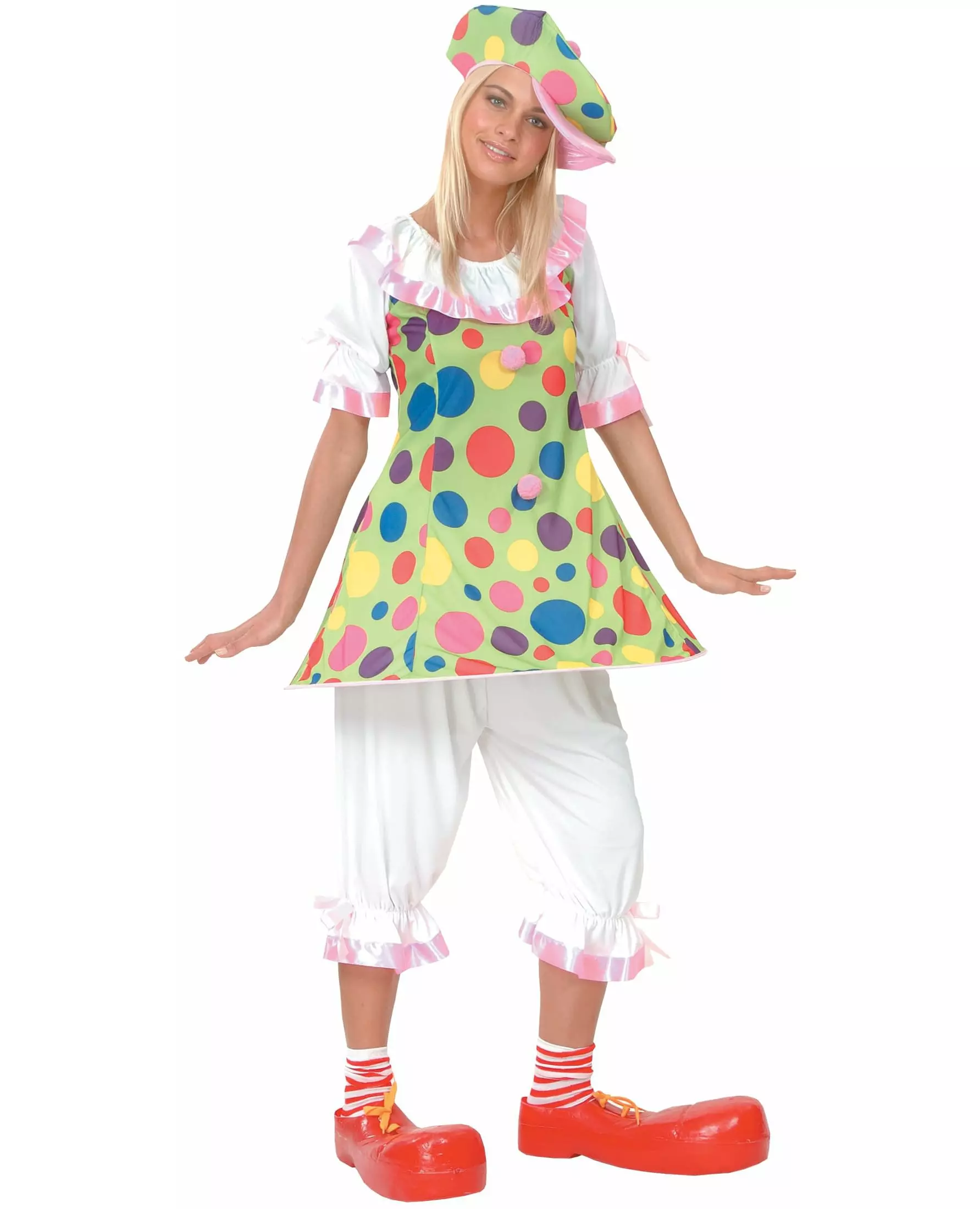 Fargerikt klovnekostyme med polkaprikker for kvinner