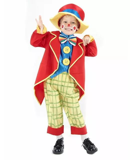 Sønnen din blir den morsomste klovnen i dette fargerike kostymet Liten klovnekostyme for gutter, som består av en lang rød jakke, en plastron som imiterer en skjorte med store knapper og påsydd sløyfe, vide bukser, strikk i livet og en hatt. (Sko ikke inkludert) Dette kostymet er ideelt for å lage vitser og få vennene dine til å le på karneval, bursdagsfest eller annen fest. Inkludert tilbehør: Jakke Brystplate Bukser Hatt Materiale: 100 % polyester Stell: For hånd Målinformasjon: For størrelse 3/4 år, bukser 48 cm lange, jakke 31 cm lang foran og 58 cm bak ca.
