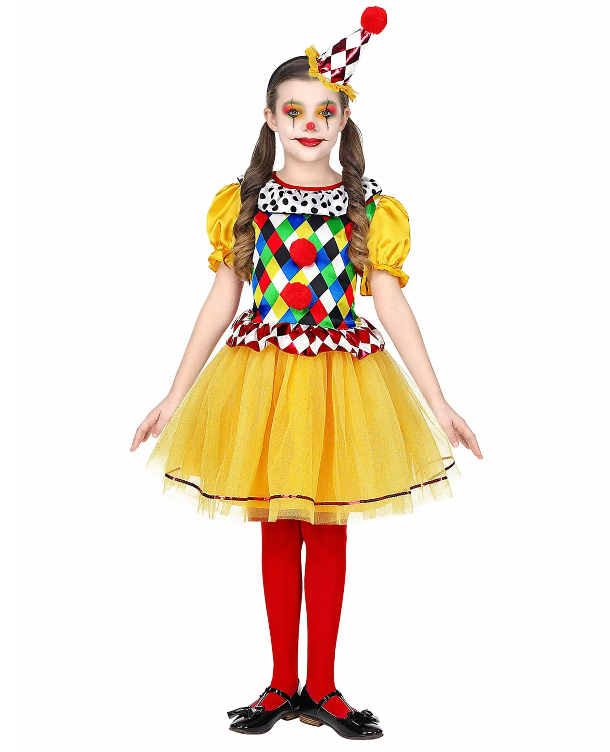 Fargerikt klovnekostyme for jenter. Legg til litt farge med dette klovnekostymet. Dette klovnekostymet for jenter består av en kjole og en hatt (strømpebukser og sko er ikke inkludert). Toppen av kjolen er trykket med flerfargede diamanter i harlekinstil. Barnekostymet inkluderer: Kjole, hatt.