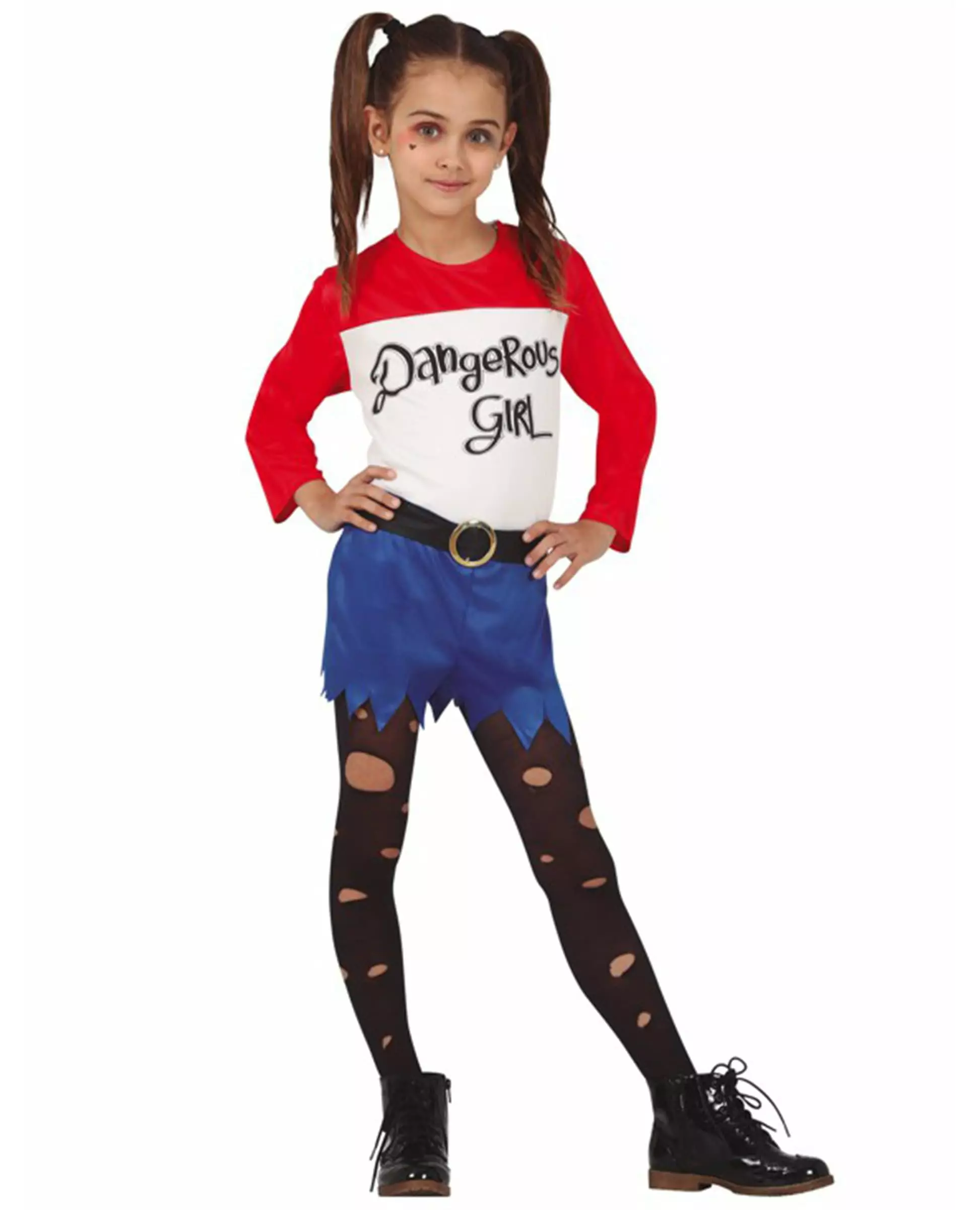 Den farligste av de opprørske småjentene! Dette farlige jentekostymet er for barn. Det består av en topp og shorts (tights og sko er ikke inkludert). Den langermede toppen er rød og hvit med påskriften «Farlig jente» i svart. De blå shortsene gir en illusjon av å være revet i bunnen med et svart spennebelte sydd på. Legemliggjør den mest berømte tegneseriefiguren med dette farlige jentekostymet! Inkludert tilbehør: Topp Shorts med belte Materiale: Polyester Vedlikehold: Håndvask