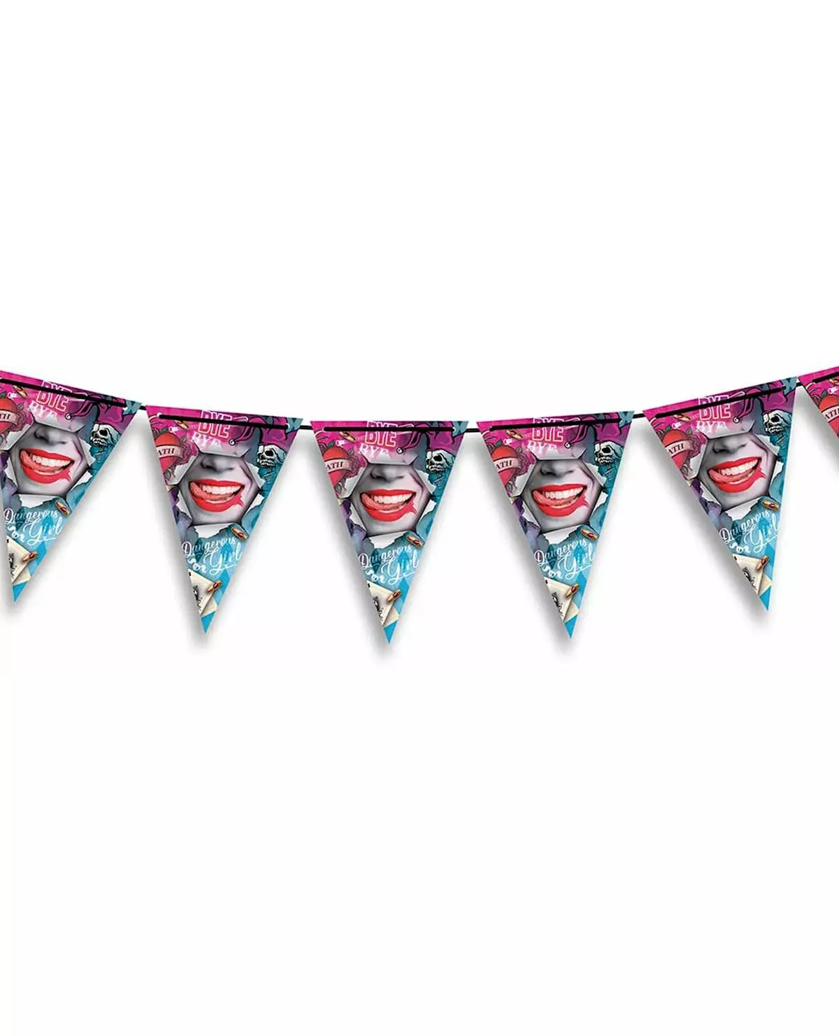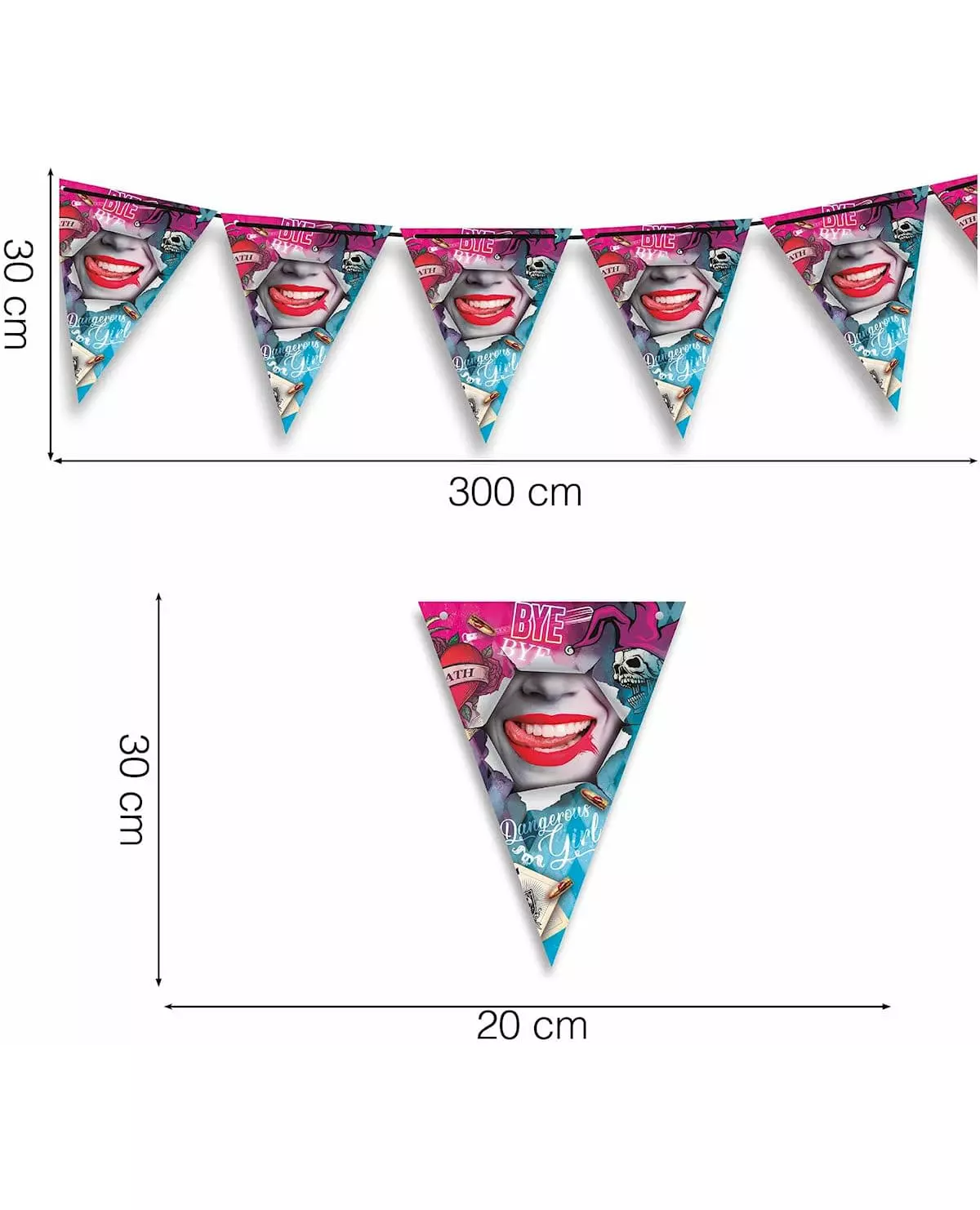Gi Halloween-dekorasjonen din et snev av fantasi! Denne farlige jentegirlanderen måler omtrent 300 cm lang. Girlanderen består av vimpler på 20 x 30 cm, som hver har en kvinnemunn med rød leppestift og er dekorert i rosa og blå toner. Girlanderen er laget av PVC. Det er en perfekt girlander for en temabursdagsfest! Inkludert tilbehør: 1 vimpelgirlander Materiale: PVC