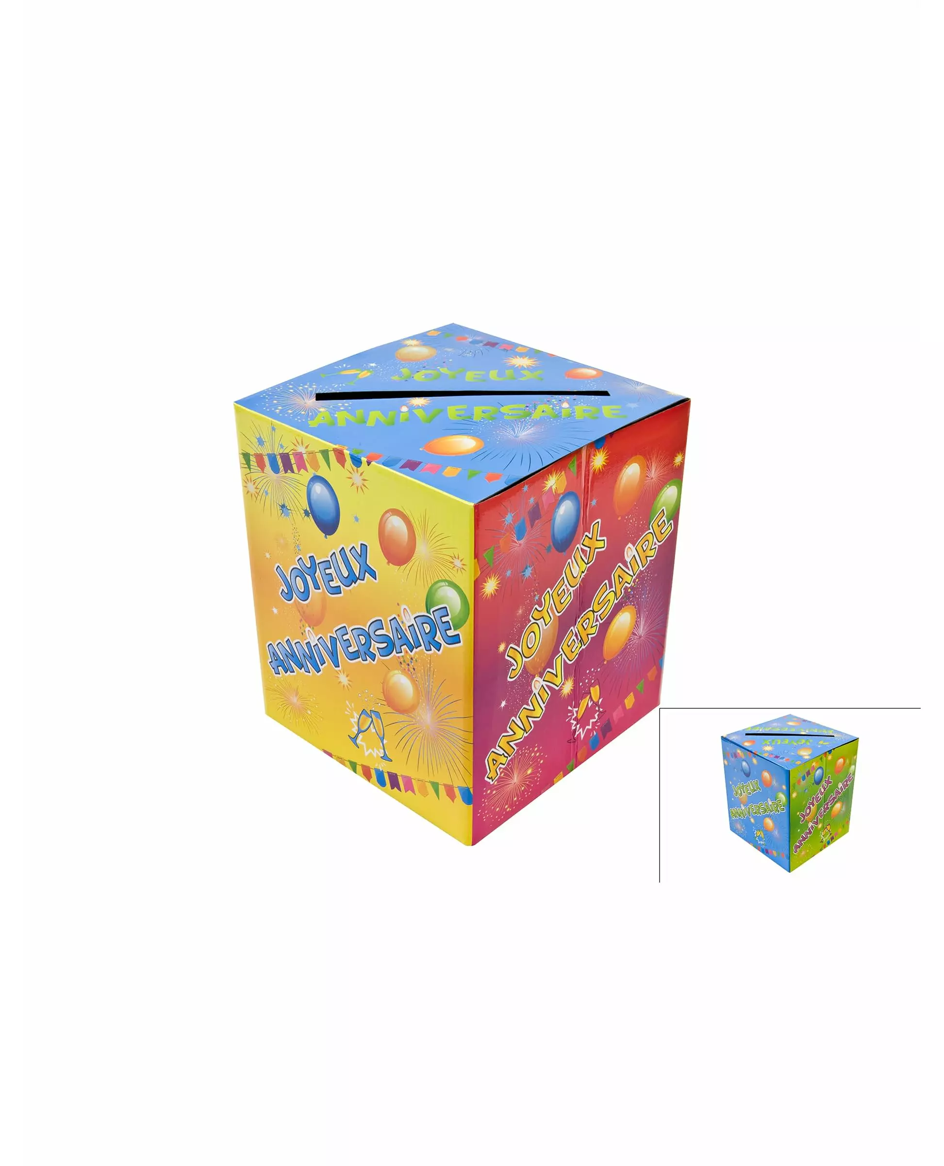 En sparegris for å planlegge den vakreste gaven! Denne bursdagssparegrisen er laget av papp. Den er selvmonterbar og lett å brette ut. Den måler omtrent 20 x 20 x 23 cm og har et spor på toppen. Sidene av sparegrisen har en flerfarget bakgrunn og er alle trykt med ordene «GRATULERER MED DAGEN» i fargede bokstaver. Mønstre omgir inskripsjonen. Ballonger, girlandere og fyrverkeri setter stemningen for festen. For en munter og fargerik bursdag er det opp til deg å finne en strategisk plassering for sparegrisen, slik at hver gjest kan delta i en fantastisk gave! Inkludert tilbehør: 1 urne Materiale: Papp