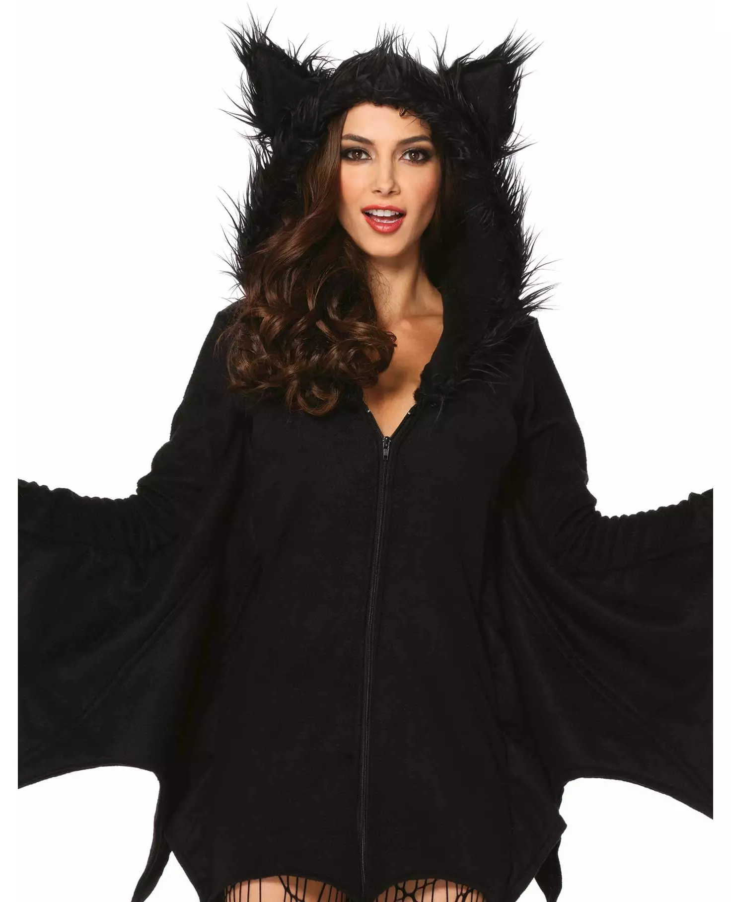 Lag en overraskelse til Halloween! Dette flaggermuskostymet for kvinner består av en hettejakke (tights og sko er ikke inkludert). Jakken er svart i et stoff med fleece-effekt. Syntetisk hår går langs hetten og ørene. Den har flaggermusermer som representerer dyrets spisse vinger. Denne jakken lukkes foran med glidelås. Dette flaggermuskostymet vil overraske gjestene dine på Halloween-kvelden. Inkludert tilbehør: Hettejakke Materiale: 100 % polyester Pleie: Håndvask