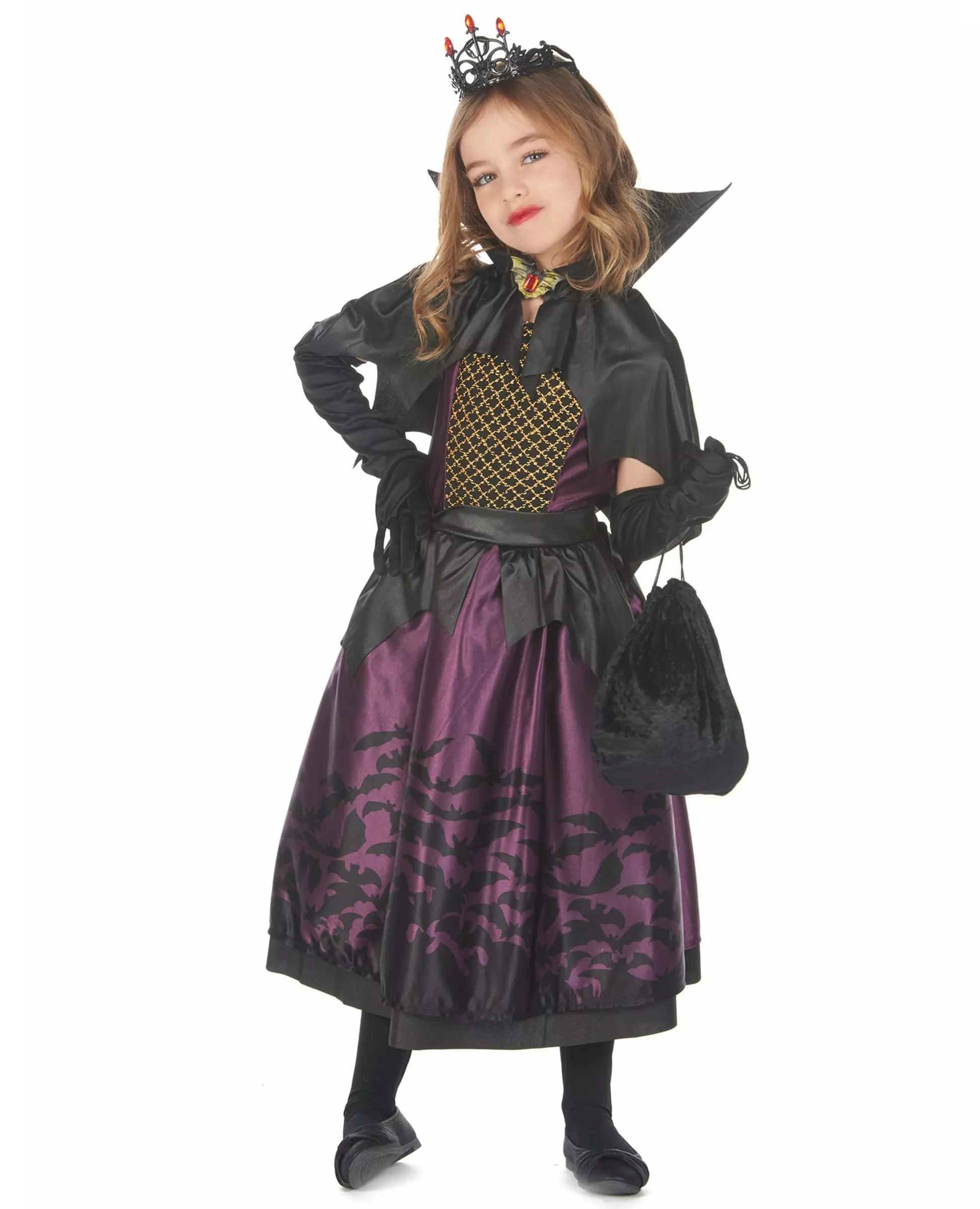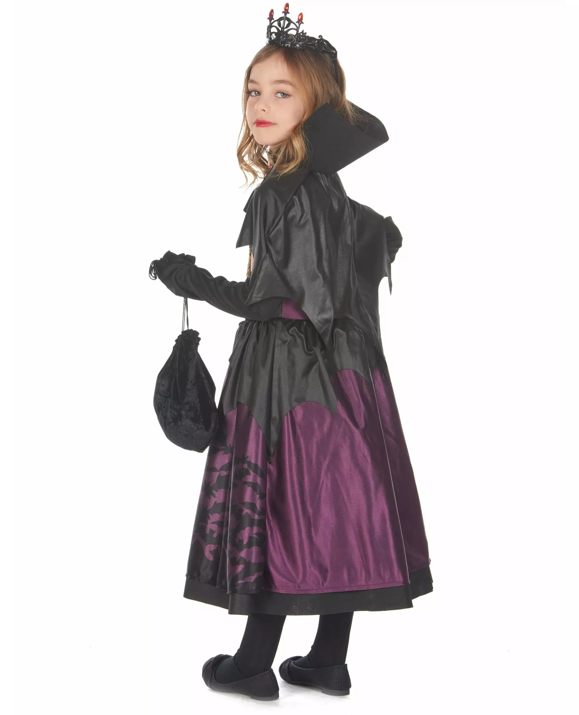 En søt liten flaggermus! Dette flaggermuskostymet for jenter består av en kjole, et skuldertrekk og hansker (strømpebukser, sko og hårtilbehør er ikke inkludert). Kjolen er lilla og har et falskt belte og svarte rysjer i livet. Midten av toppen av kjolen er svart og gull. Undersiden er lilla og er dekorert med flaggermus som flyr inn i natten. Skuldertrekket er svart med en høy krage. Det er dekorert med en praktfull gyllen flaggermus med en rød juvel. De lange hanskene er svarte med en satengeffekt. Dette søte flaggermuskostymet vil være ideelt for datteren din til Halloween-festen! Inkludert tilbehør: Kjole, skuldertrekk, hansker,