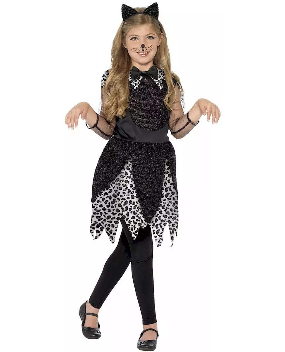 Vær en katt! Dette kattekostymet for jenter består av en kjole, en hale og et pannebånd (strømpebukser og sko er ikke inkludert). Kjolen festes bak med borrelås. Den er svart med skinnende deler og grått flekkete stoff på kragen og skjørtet, samt svart slør med sølvprikker på ermene. En svart satengsløyfe fullfører halsutringningen. Halen, som matcher pannebåndet og kjolen, er laget av skinnende svart stoff. Den festes til baksiden av kjolen med borrelås. Pannebåndet er toppet med to svarte skumører med små skinnende tråder. Dette kattekostymet vil være perfekt for å leke en søt katt på karneval, Halloween eller en utkledningsfest. Inkludert tilbehør: Kjole Halepannebånd Materiale: 100 % polyester Vedlikehold: Håndvask