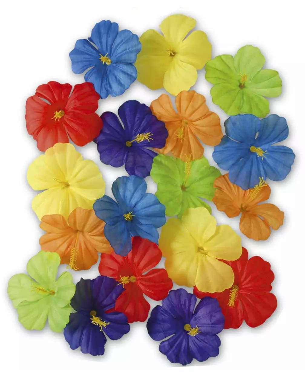 Gi det hawaiiske bordet litt ekstra hygge! Dette settet består av 18 stoffblomster. Disse forestiller hibiskusblomster og måler omtrent 10 cm i bredden. De er røde, oransje, grønne, blå, lilla og gule. Disse blomstene vil være perfekte som tilbehør til romdekorasjonen din for en strandtemafest. «Copyright Widmann SRL». «Copyright Widmann SRL. Inkludert tilbehør: 18 blomster
