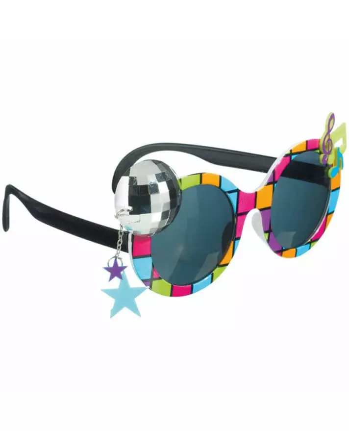 Med disse brillene kommer det til å groove! Disse discobrillene for voksne er laget av plast. De har en ramme med avrundede former, med flerfargede firkanter. På venstre side er en falsk discokule, som er festet til to fargede stjerner. På høyre side finner du musikalske noter. Stengene er svarte, og linsene er tonet svarte. Disse brillene vil være perfekte for å fullføre discokostymet ditt på en retrokveld. Inkludert tilbehør: Briller, Materiale: Plast,