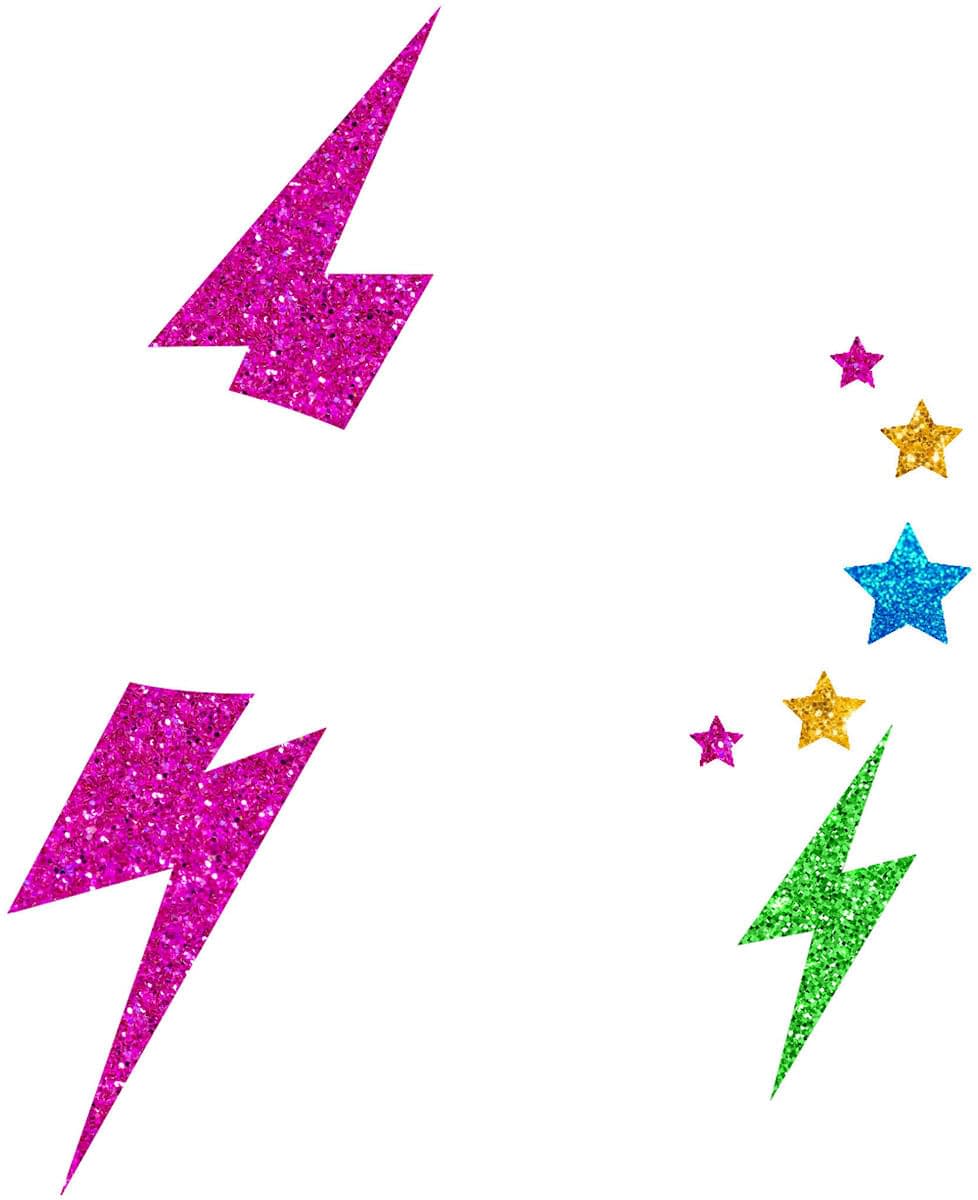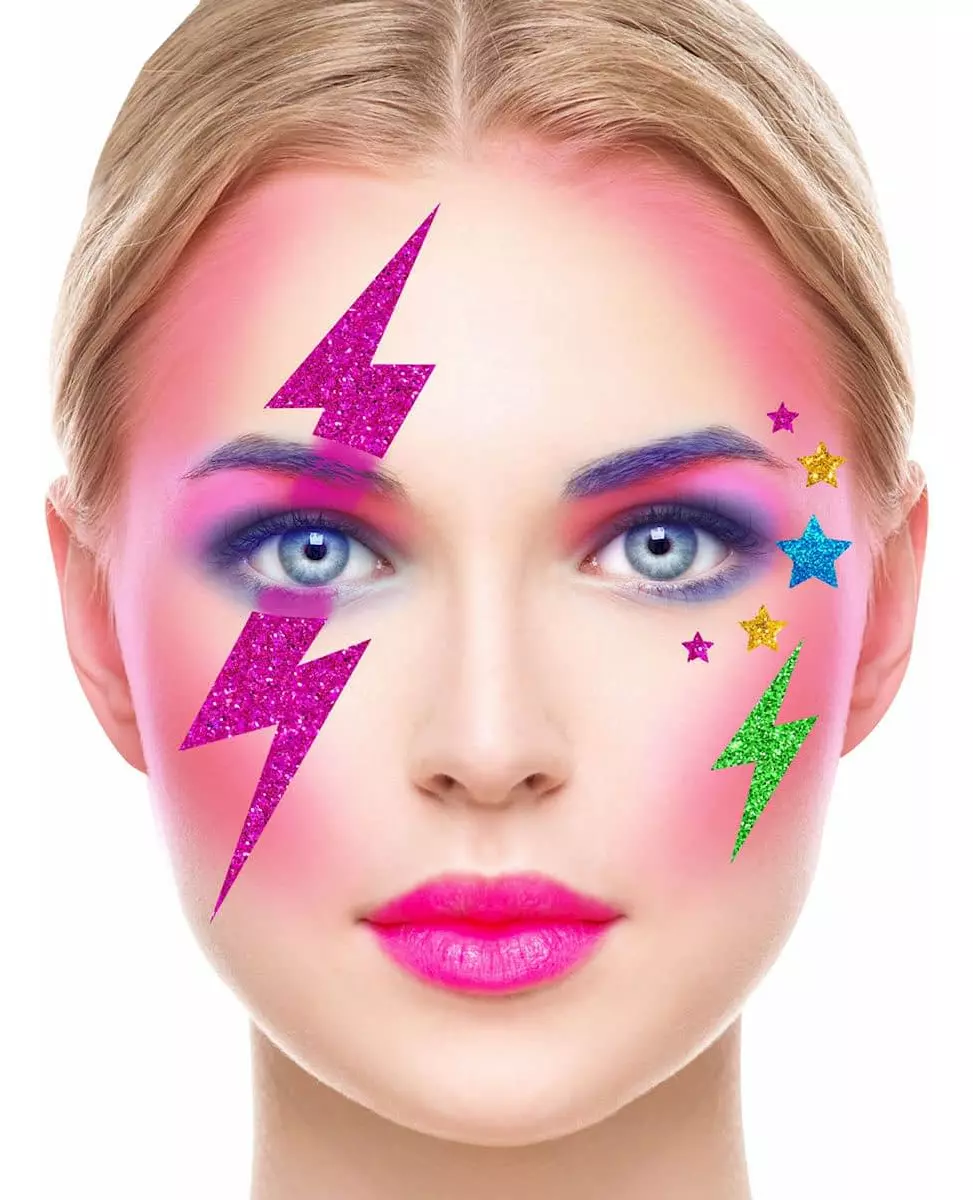 Perfekt for din neste festival! Dette arket inneholder flerfargede glitter-lyn-ansiktsklistremerker. Det inkluderer flere elementer: glitrende rosa og grønne lyn, samt fargerike stjerner for et levende og dynamisk utseende. Disse midlertidige klistremerkene er perfekte for å gi festivalantrekket ditt et dristig preg! Ingredienser: NC. Inkludert tilbehør: Ansiktsklistremerker