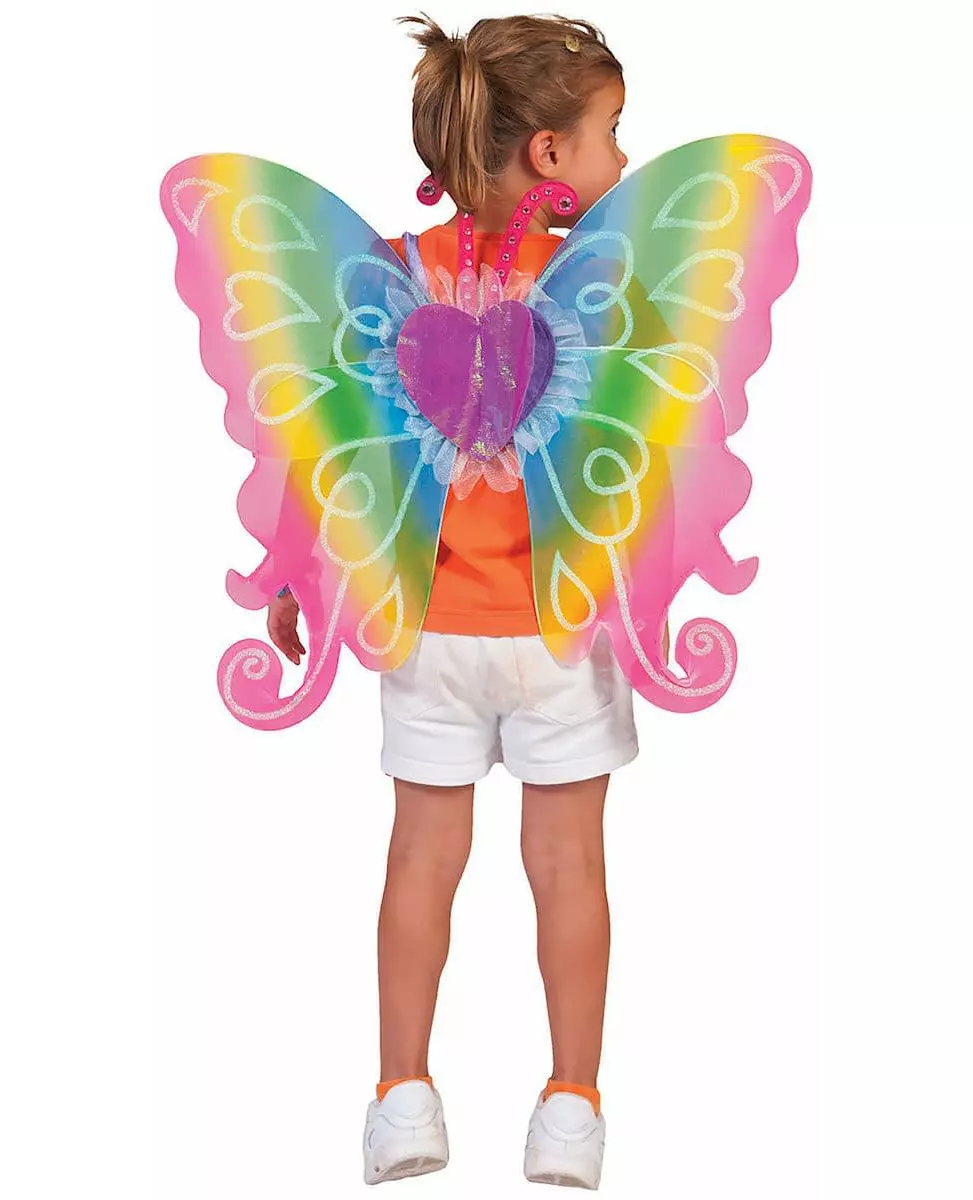 Sommerfugldronningen! Dette paret med flerfargede vinger måler omtrent 60 cm x 54 cm. Disse vingene er verdige de vakreste sommerfuglene! De har en bearbeidet form som er helt rund i en gradient av magiske farger. De er dekorert med hvite hjertemønstre. Et annet hjerte, i et perlemoraktig lilla stoff omgitt av hvit tyll, fullfører settet og sikrer en vakker kvalitet på finishen. Til slutt, for flere detaljer, er det to rosa antenner på toppen av disse vingene. Disse pene vingene, med vakker sminke, vil være perfekte for å forvandle den lille jenta din til en pen sommerfuglprinsesse til bursdagsfesten eller karnevalet hennes. Tilbehør inkludert: vinger Mål: 60 cm x 54 cm